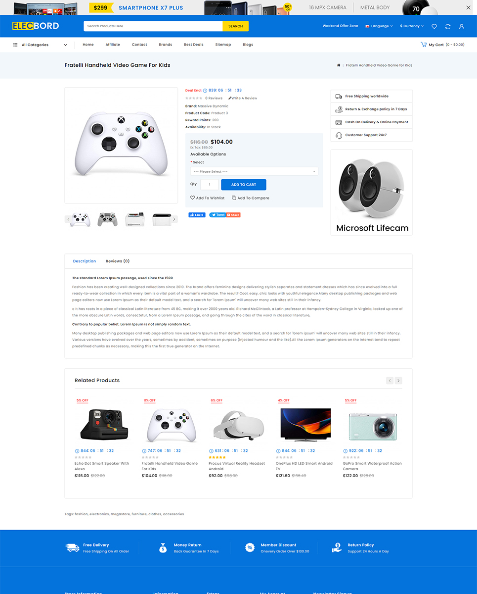 Elecbord theme is packed with useful features which will allow you to create a modern eCommerce store. Main attraction of this theme, it's product structure which is very clean to showcase your products. Deals count down timer feature display for every discounted product for number of days deals goes expire which helps you to increase sale on your store.