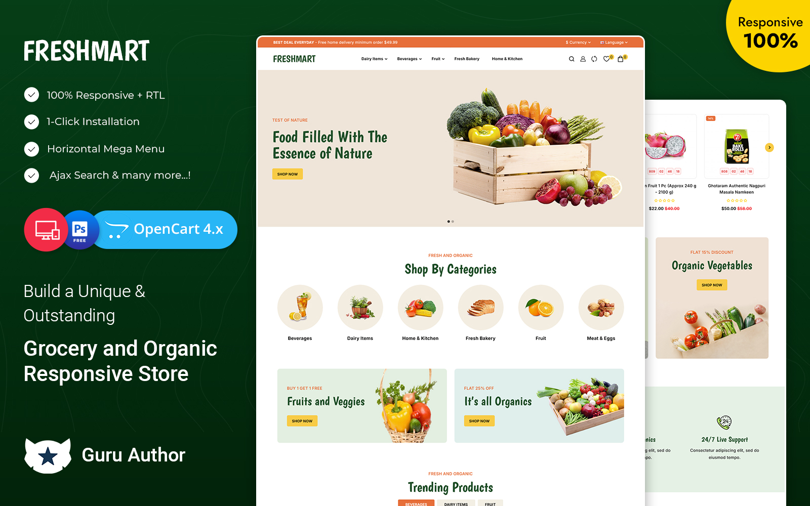 Step into the future of online grocery shopping with FreshMart – Grocery and Organic Responsive OpenCart Theme. A perfect choice for growing your eCommerce business effortlessly!