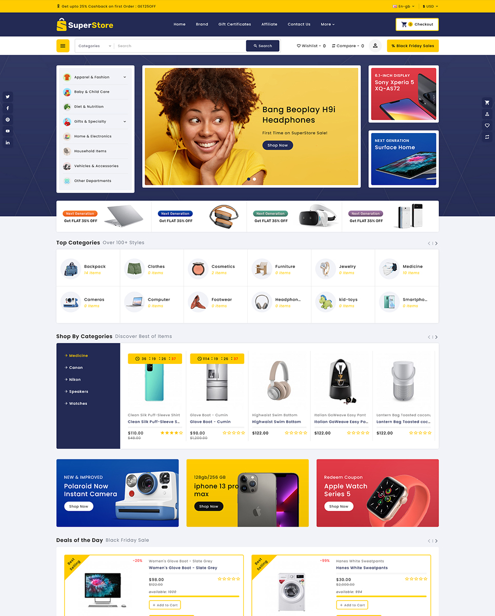 Superstore - Multivendor OpenCart Responsive Theme design is quickly adapted for all modern online stores for electronics stores, mobile shops, kitchen appliances, kids & toys, laptops, groceries, or any other eCommerce categories website.