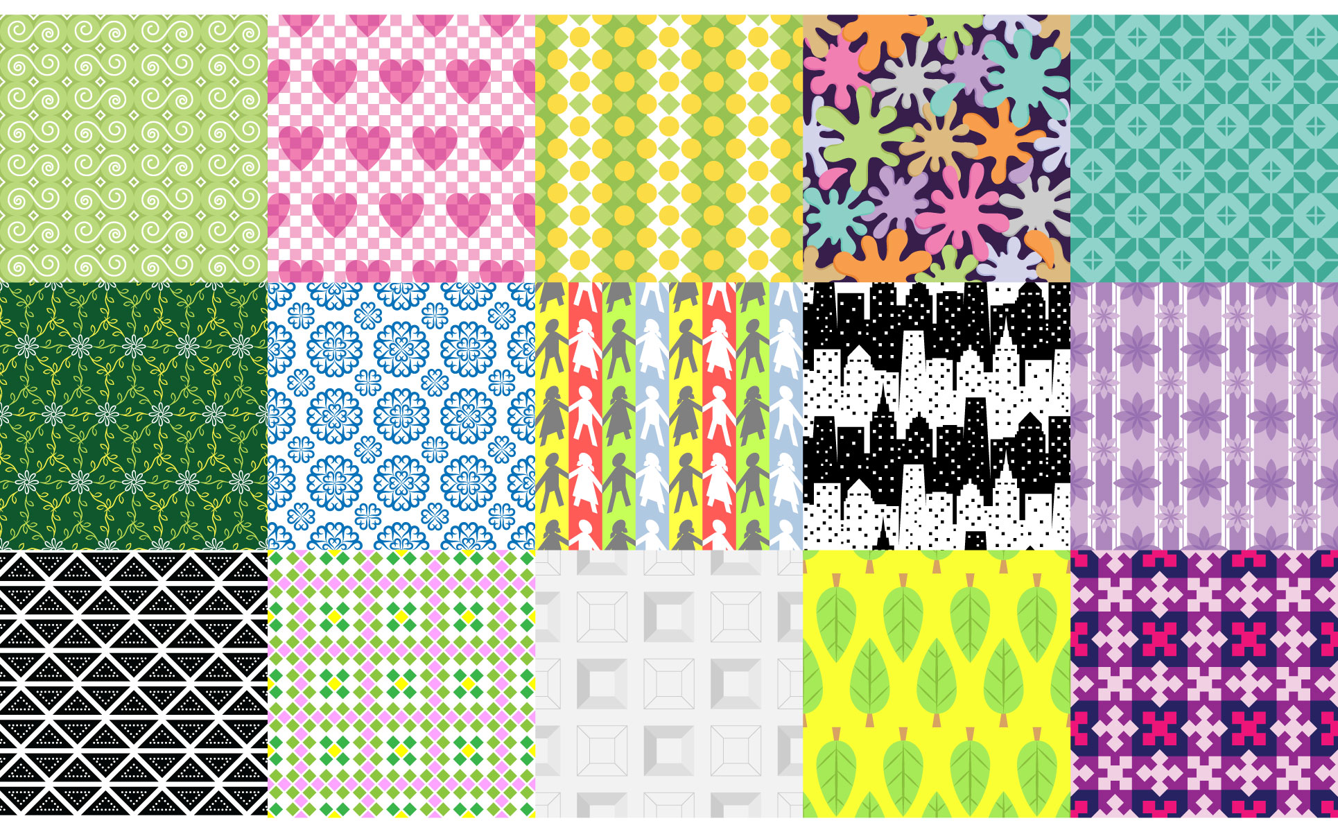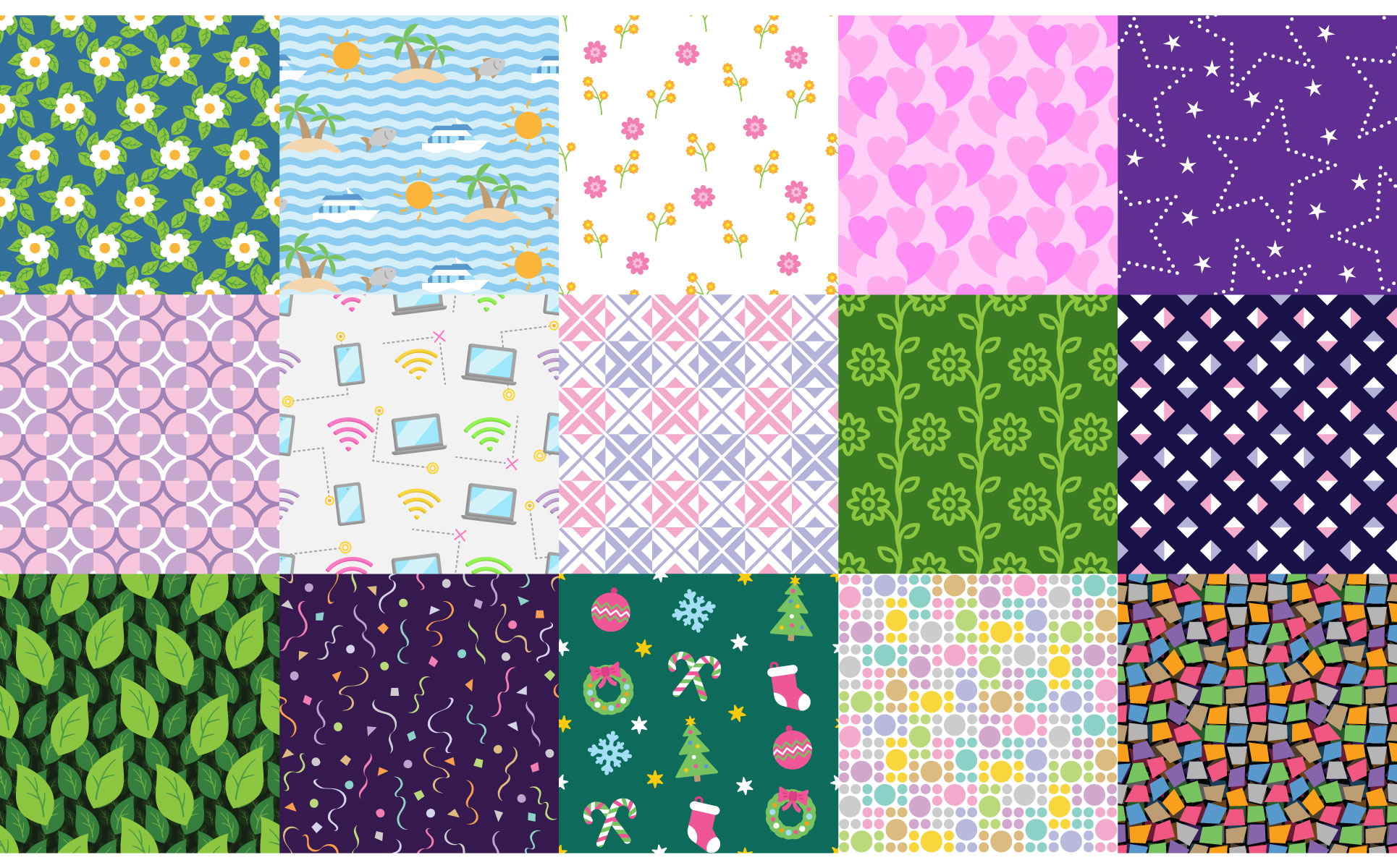 A flat patterns bundle part one. These 52 patterns are provided in vector format which can be edited and resized without loss of quality. Ideal for card, wrapping paper, brochure, wallpaper, background, banner, textile, etc.
