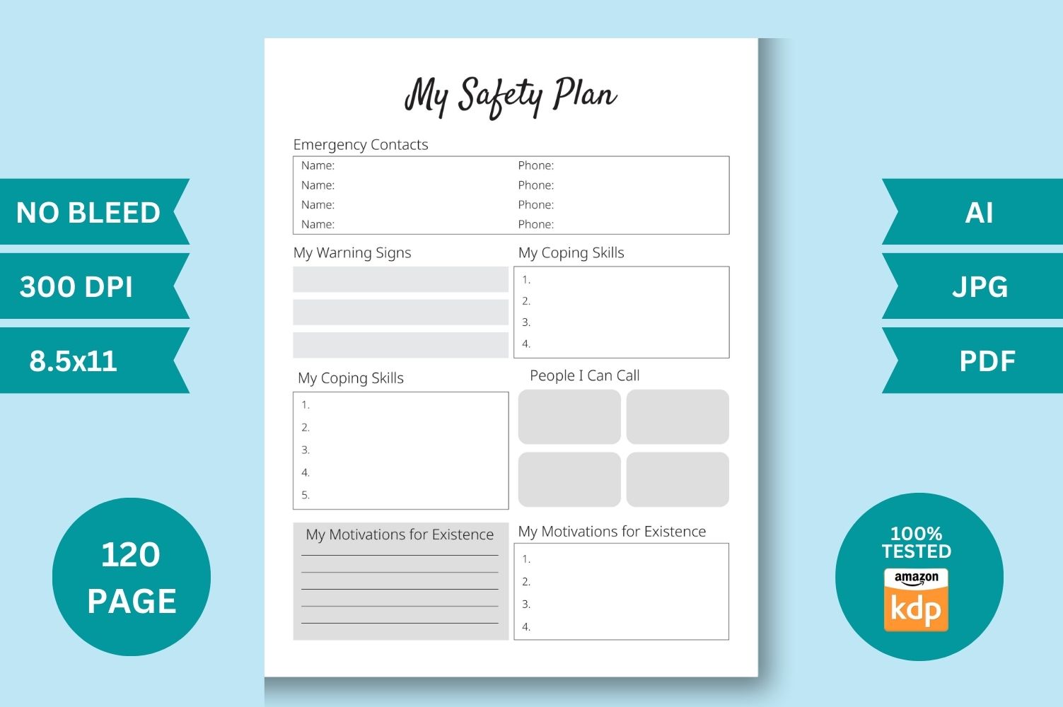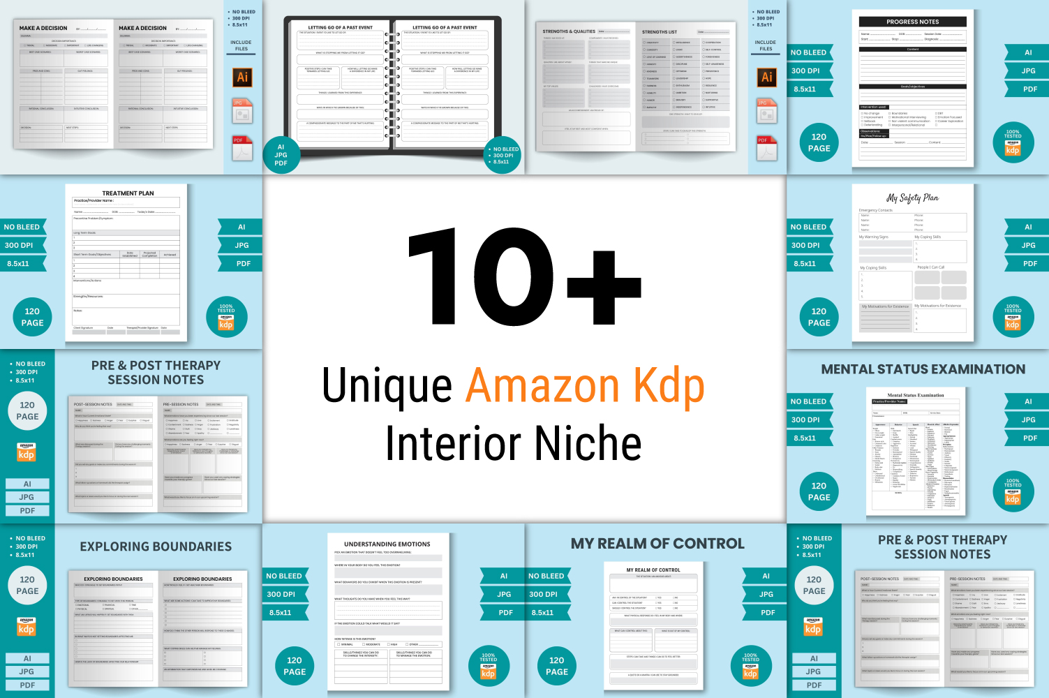 This image showcases a collection of over 10 unique interior design templates tailored specifically for Amazon Kindle Direct Publishing (KDP). These templates are well-suited for self-publishing authors, coaches, therapists, and entrepreneurs looking to create useful and professional interior pages for their journals, planners, and worksheets. The templates are available in AI, JPG, and PDF formats, with no bleed, 300 DPI resolution, and an 8.5x11-inch size.