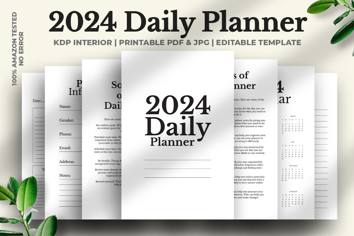 Hi, This 2024 Daily Planner Kdp Interior With 7 Different Pages 100% Tested on Amazon KDP is perfect for growing fastly your KDP Low & No content book publishing business on Amazon 100% vector editable & resizable PDF, you can change the size easily because It's also vector & adobe illustrator supported PDF, also ready for notebook, journal, diary, ready to printing.