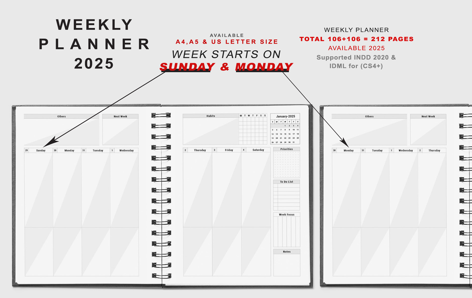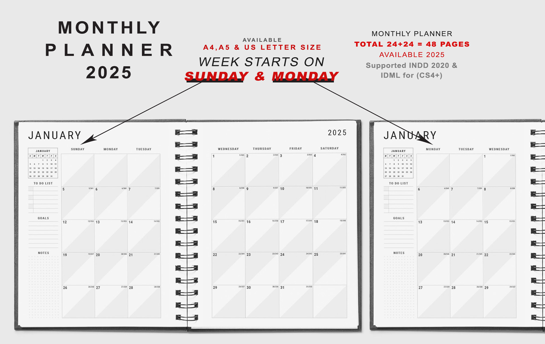 This is Editable and Printable 2025 WEEKLY & MONTHLY SUNDAY & MONDAY STARTS PLANNER. Template has everything you need to get started! Choose from InDesign PLANNER template pages to quickly and easily create your Goals. You can add your own personal touch by changing the colors, fonts, layouts and backgrounds. Everything is customizable with InDesign interface. When you download you will get a printable pdf doc and one PDF Instructions file for customization InDesign template.