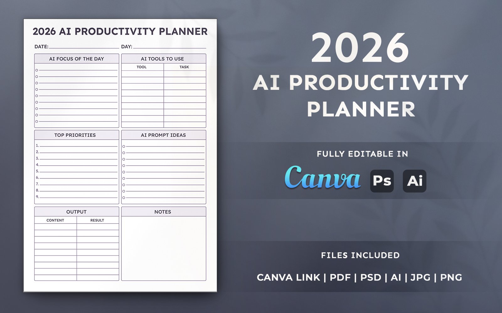 2026 AI Productivity Planner Template – AI Business Organizer, Printable and Minimal Layout Design