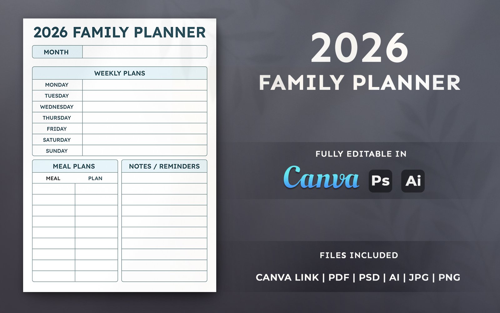2026 Family Planner Template – Printable Planner, Organizer, Editable Canva Layout