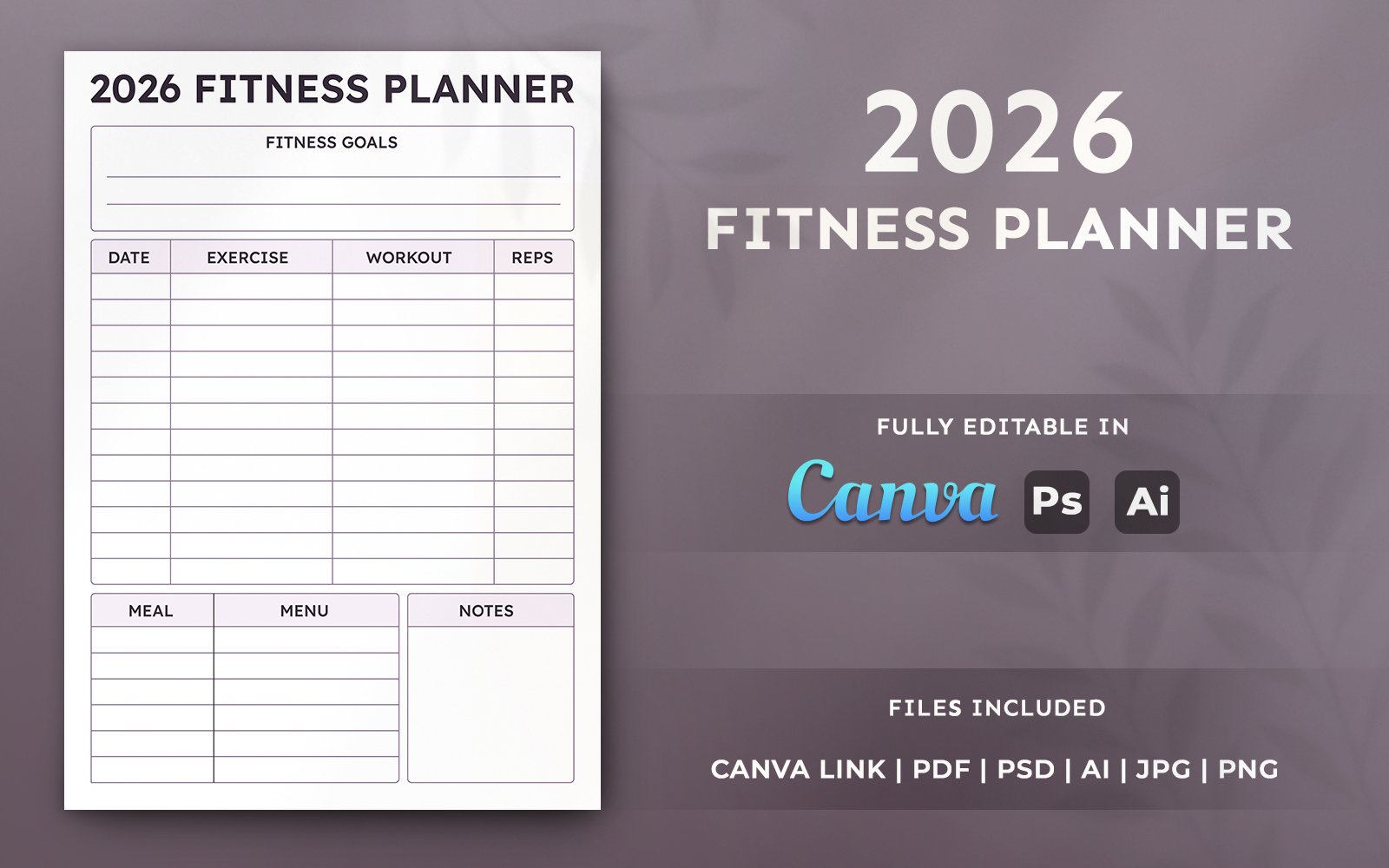 2026 Fitness Planner Template - printable and Editable Canva Layout Design