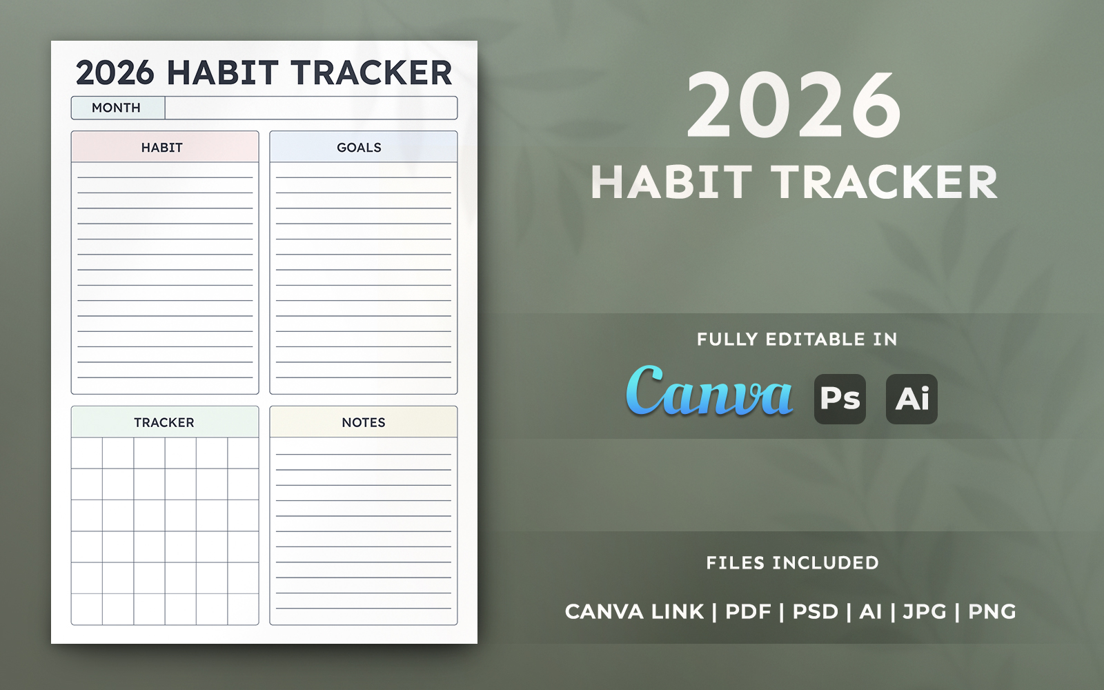 2026 Habit Tracker Template – Printable Planner, Editable Canva Page Template