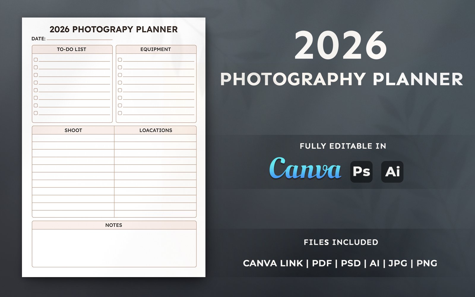 This 2026 Photography Planner Template is designed to help photographers, studios, KDP low-content publishers, printable planner sellers, and designers organize their workflow with ease. It includes structured pages for shoot planning, locations, equipment lists, to-do tasks and notes, making it ideal for client sessions, event shoots, and studio management. The template is fully editable in Canva, Adobe Illustrator, and Photoshop, allowing effortless customization to match any brand style. An instruction PDF is included for quick setup and export guidance.