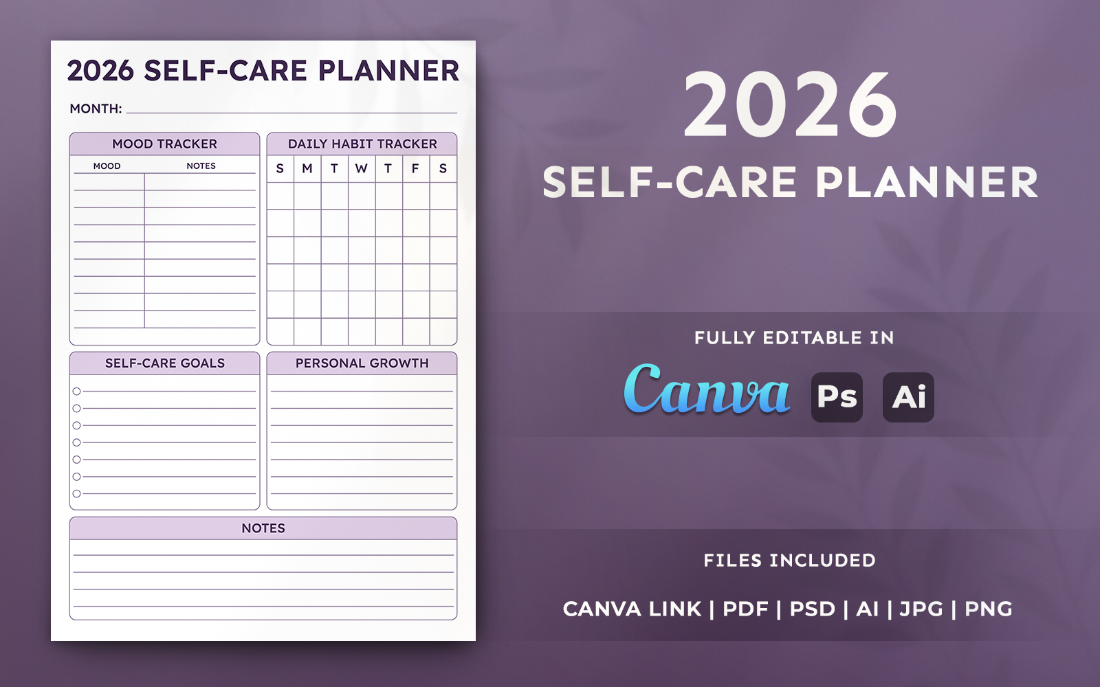Take control of your well-being in 2026 with this Self-Care Planner Template, designed to help you plan, reflect, and maintain a healthy lifestyle. Ideal for KDP low-content publishers, printable planner sellers, and designers, this editable planner helps track habits, set self-care goals, and manage routines effortlessly.