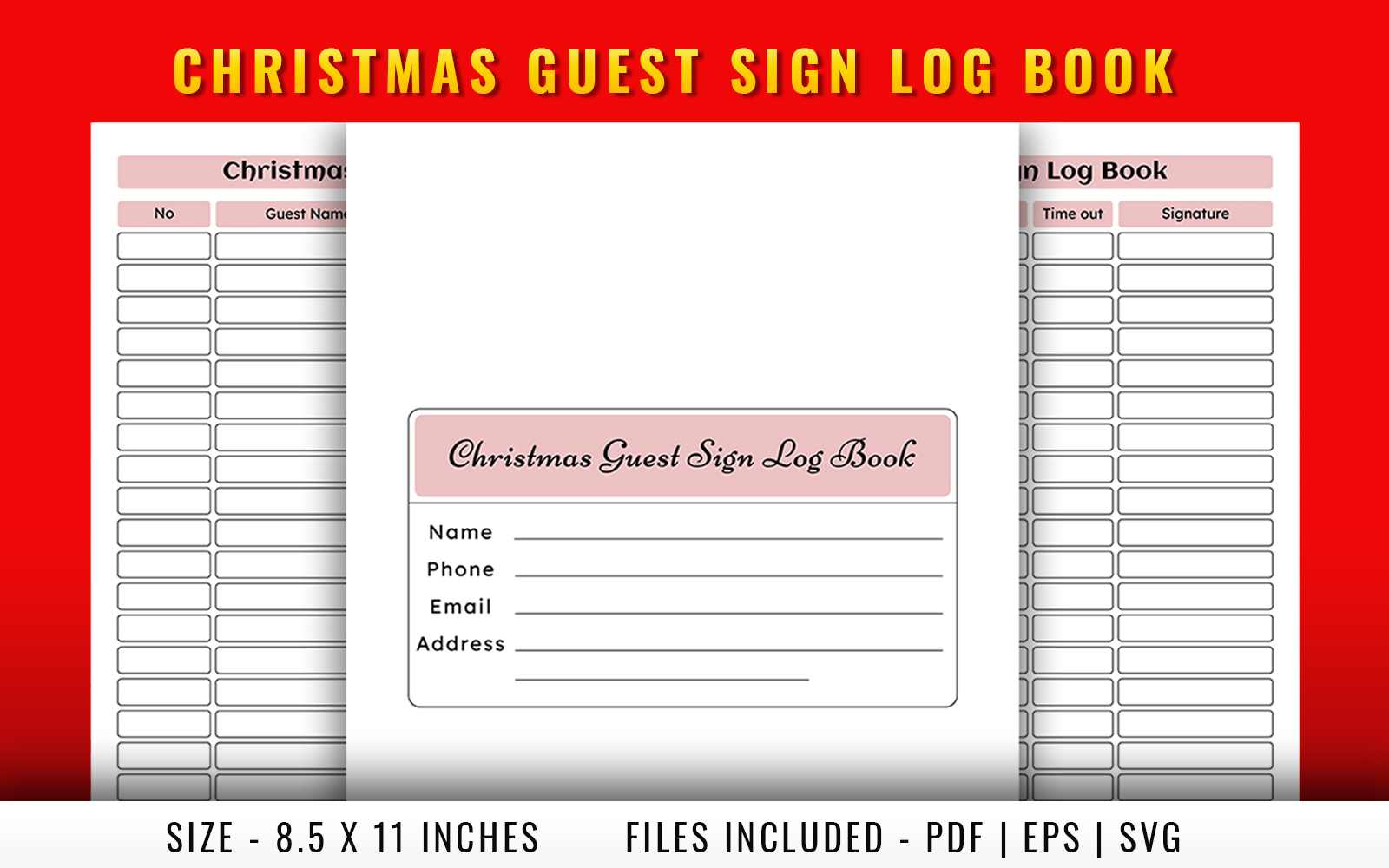 Create a stunning print-ready Christmas guest sign log book, perfect for KDP low-content book publishing. This 100-page log book is designed in large size (8.5 × 11 inches), ensuring ample space for guest entries. With no bleed, 300 DPI resolution, and editable source files in PDF, EPS, and SVG formats, it's ready for high-quality printing. Ideal for holiday events, parties, or gatherings.