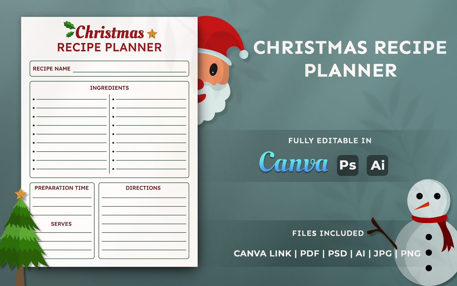 Easily editable in Canva, Adobe Illustrator, and Photoshop, the planner includes a detailed instruction PDF to make customization simple and fast. Simplify your holiday cooking and planning while keeping everything organized in one stylish, functional planner.