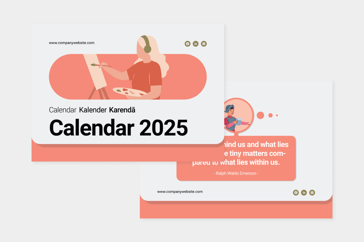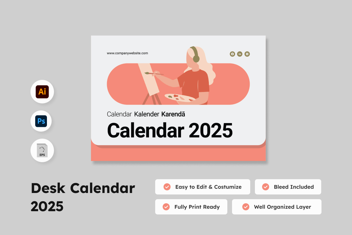This 2025 desk calendar features a sleek layout with bold typography and vibrant colors. Ideal for adding a dynamic touch to your desk while keeping track of important dates and tasks throughout the year.
