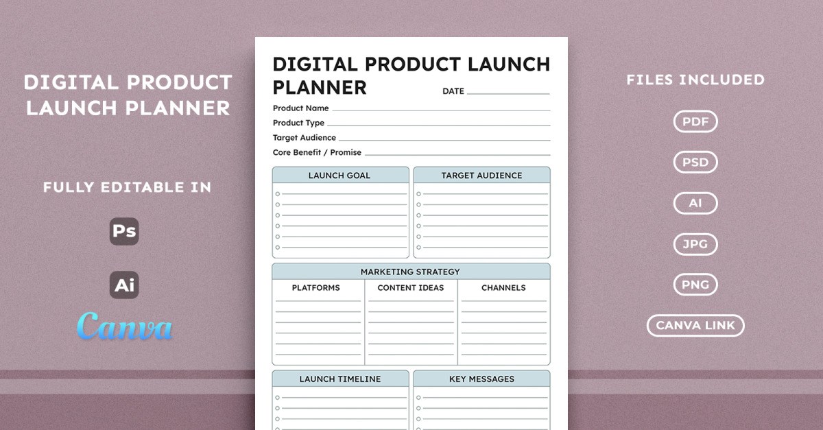 The Digital Product Launch Planner Template is a structured, editable planning layout designed to organize product details, define launch goals, research target audiences, build marketing strategies, manage content ideas, track channels, plan launch timelines, and align key messages. This planner is perfect for KDP low-content publishers, printable planner business owners, designers, entrepreneurs, ecommerce sellers, coaches, and digital product creators. It fits product launches, ebook releases, online course launches, app launches, brand launches, and startup campaigns. Easily editable in Canva, Adobe Illustrator, and Photoshop with no design experience required. A detailed instructions PDF is included to help you customize and use the template quickly.