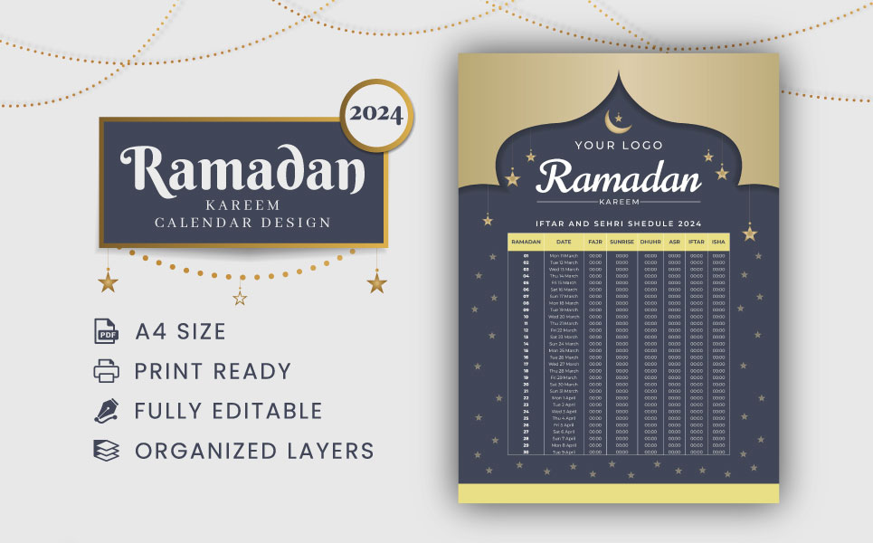 Hi, This is a Ramadan Kareem Timing Calendar 2024. The calendar is print-ready, with a CMYK color profile. Open the AI file in Adobe Illustrator to access all editable elements. Personalize text, colors, and layout to suit your preferences. Enjoy complete control over every element with organized layers for easy customization.
