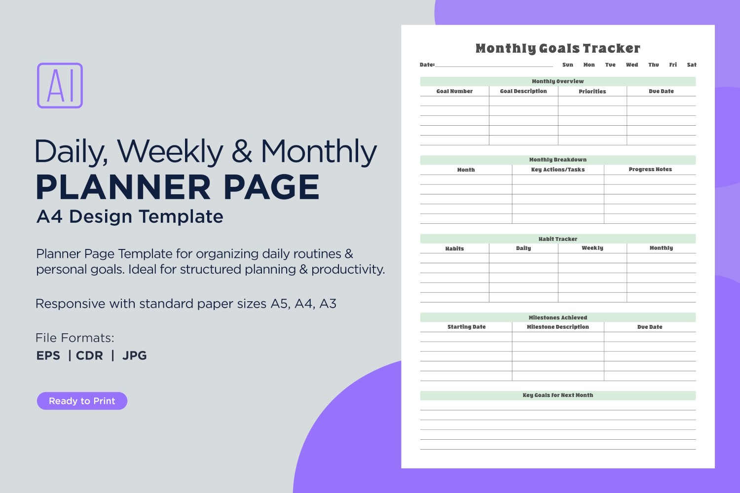 The planner sheets are provided in PDF, EPS, and JPG formats, making them versatile and ready for printing. Whether for personal, professional, or academic use, these pages support streamlined scheduling and goal setting. Perfect for enhancing productivity, they are a practical resource for anyone looking to stay organized and efficient.