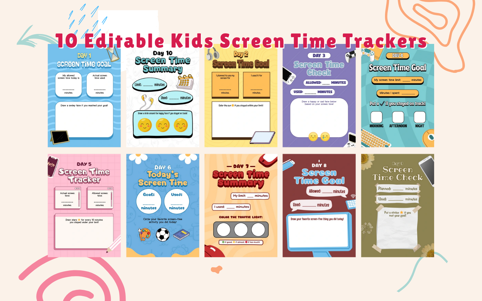 ✅ 10 Editable Kids Screen Time Trackers with timers, reward tokens & tech-balance goals