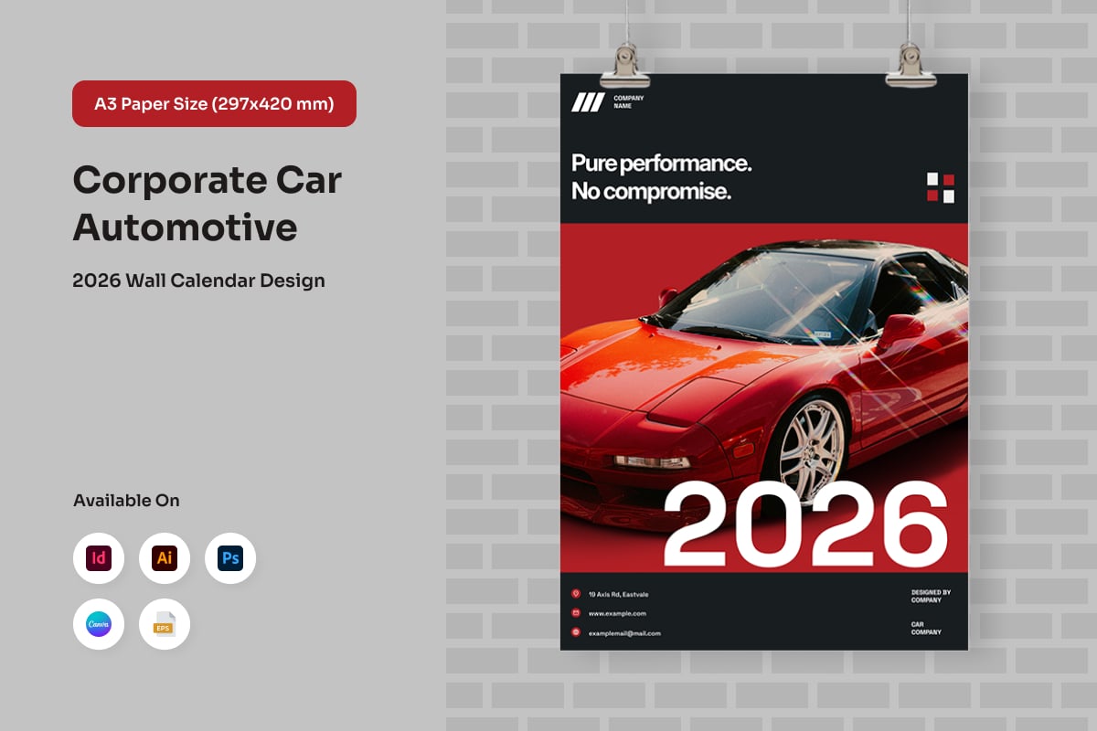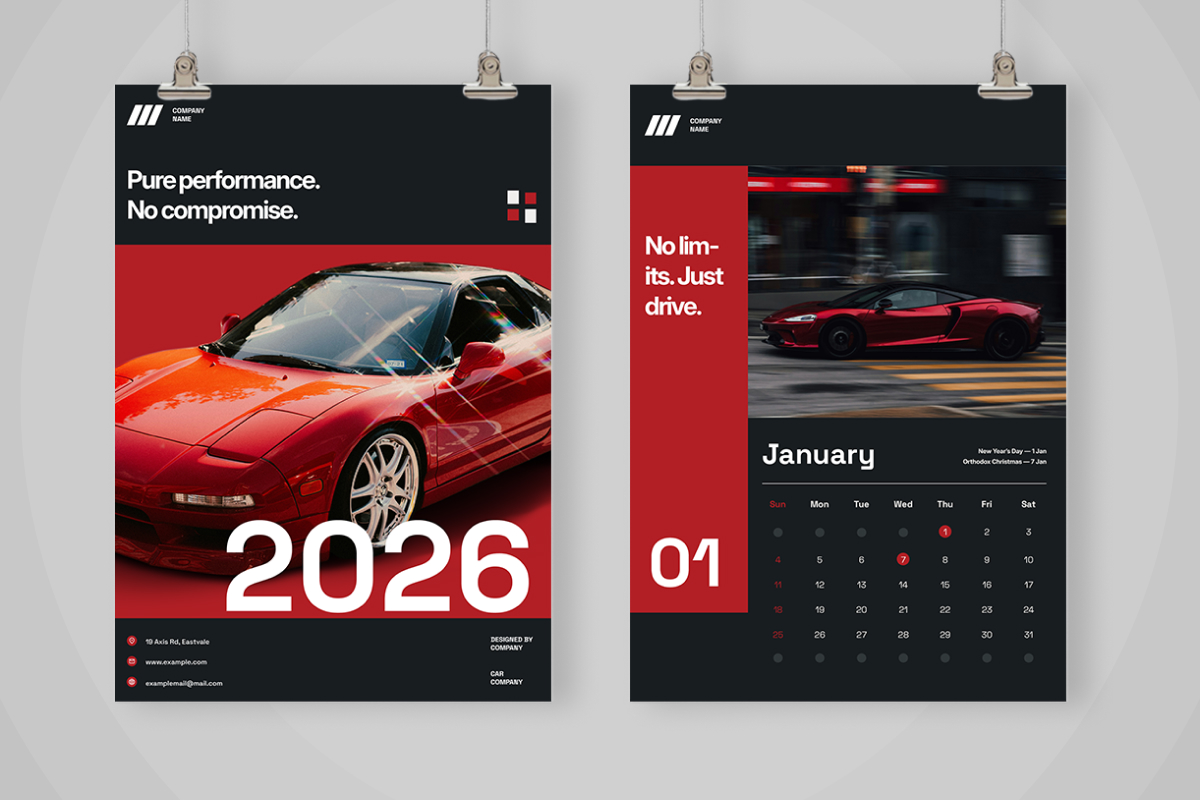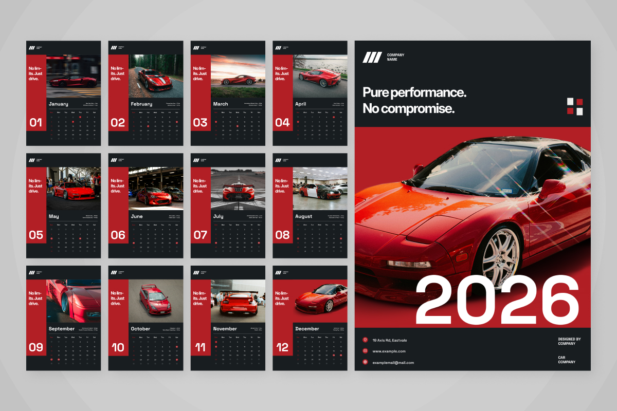 This Wall Calendar design merges sophistication and speed with its sleek layout and editorial-style photo focus. Ideal for showcasing high-end cars or automotive events, it delivers a bold visual statement that blends elegance with performance aesthetics.