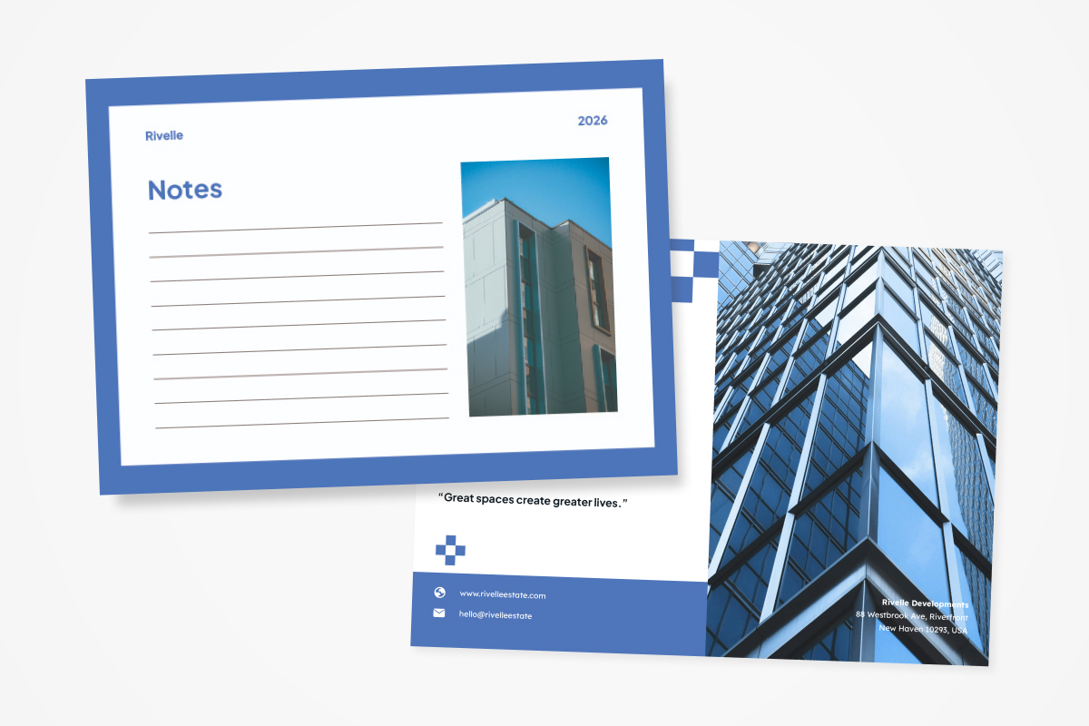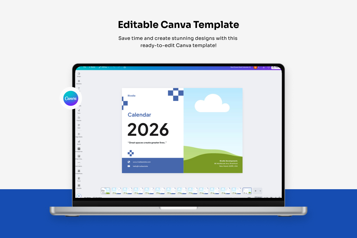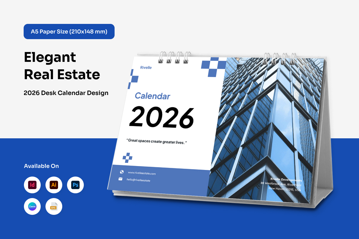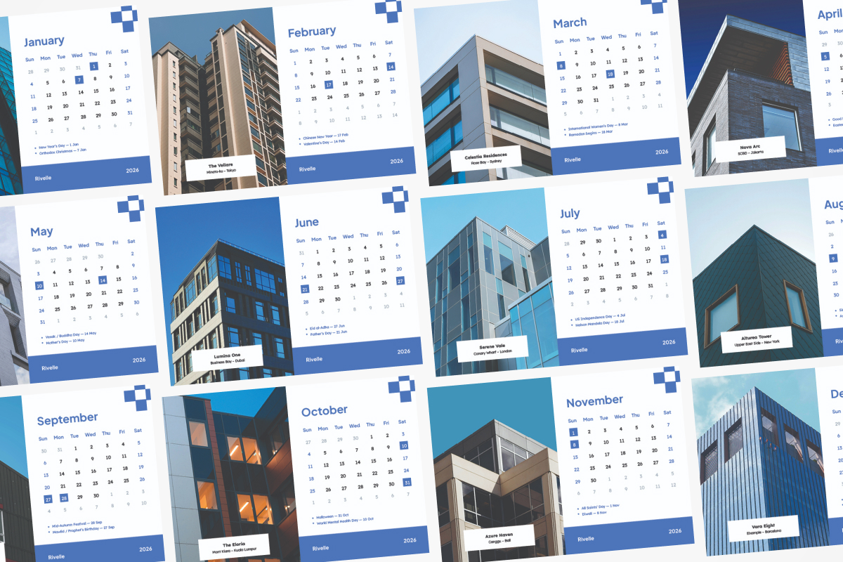 Elevate your property marketing with this premium desk calendar, designed with a modern and elegant aesthetic. Its clean layout, spacious date boxes, and refined typography make it perfect for showcasing real estate branding on office desks or sales galleries.