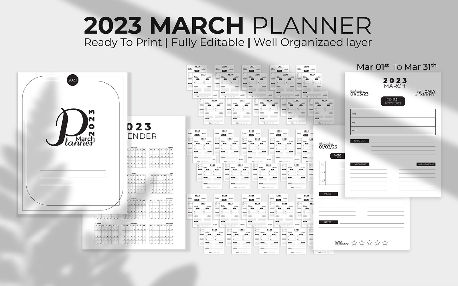 Hi, This is Excellent Easy to use March Daily KDP Planner 2023 With Separate Date, All Element are Fully Vector, Editable and Ready to Printing, They are 100% Editable and Scalable without Losing Resolution, so easy to resizing and customizing.