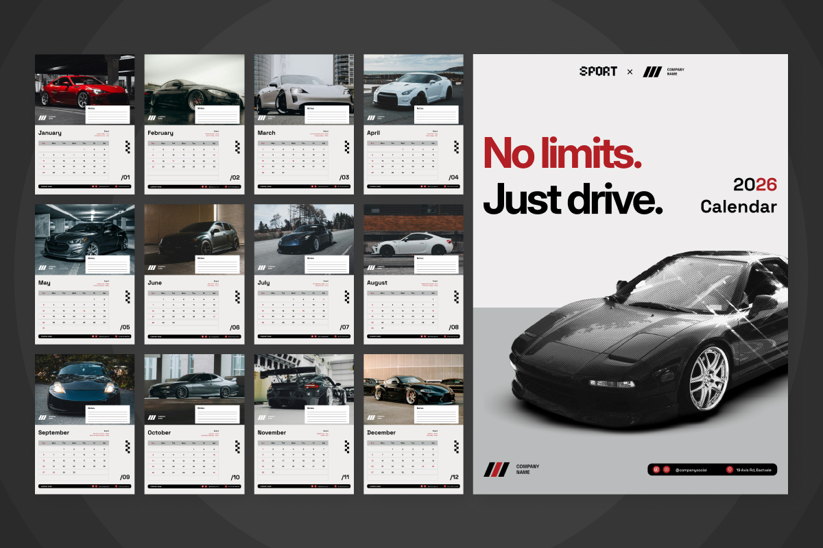 A clean, photo-driven calendar template built for professional automotive brands. Each page is structured with clear date grids, angled shapes, and impactful typography that evoke strength and motion — key to the automotive world.