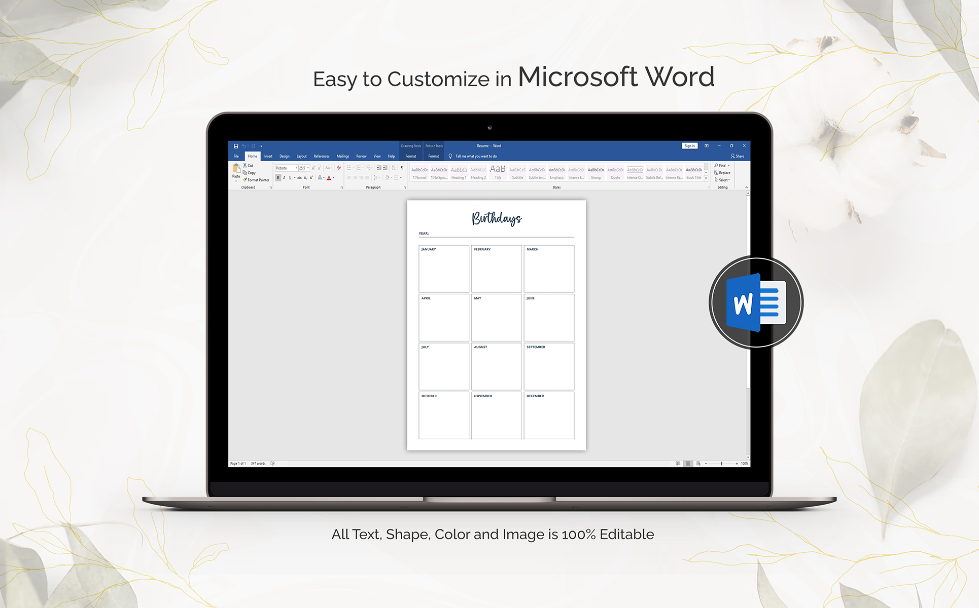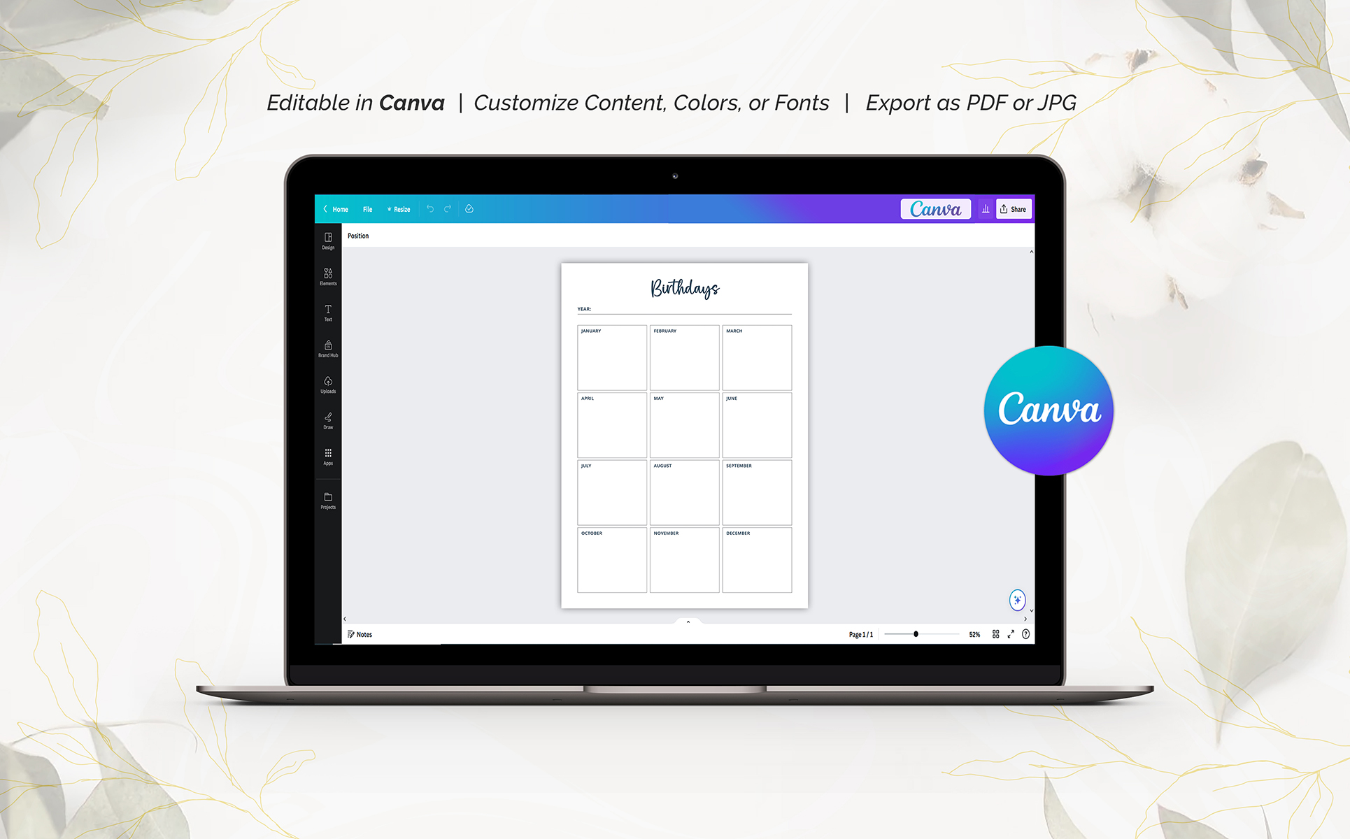 This digital download birthday planner comes in multiple formats – Canva, MS Word, and Illustrator – giving you full flexibility to edit and customize. Whether you prefer typing directly into the file or printing a blank template to handwrite, this planner is designed for ease of use and maximum functionality.