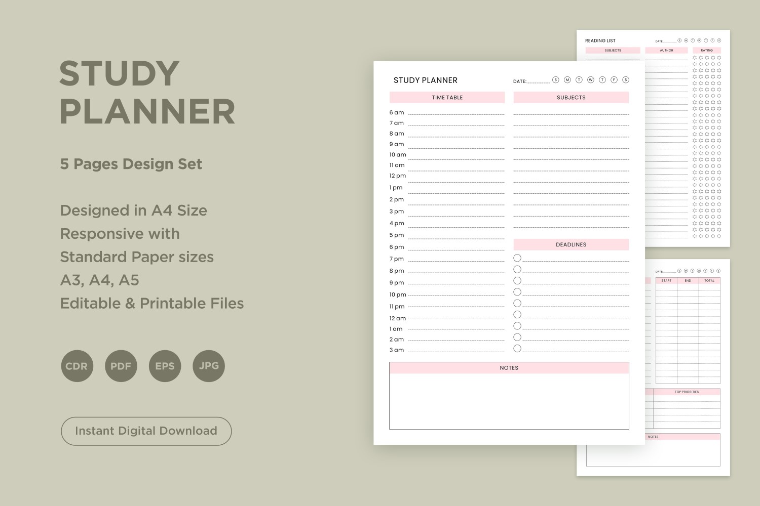 Introducing the Study Planning Pages Collection: a comprehensive set of tools designed to streamline your academic journey. The collection features 5 unique design layouts, This collection includes various planning sheets to help you manage different aspects of your studies effectively. Available in PDF, EPS, and JPG file formats, these customizable sheets can be downloaded and printed instantly, making them ready for immediate use. Enjoy the organization and clarity these planners bring to your study routine.