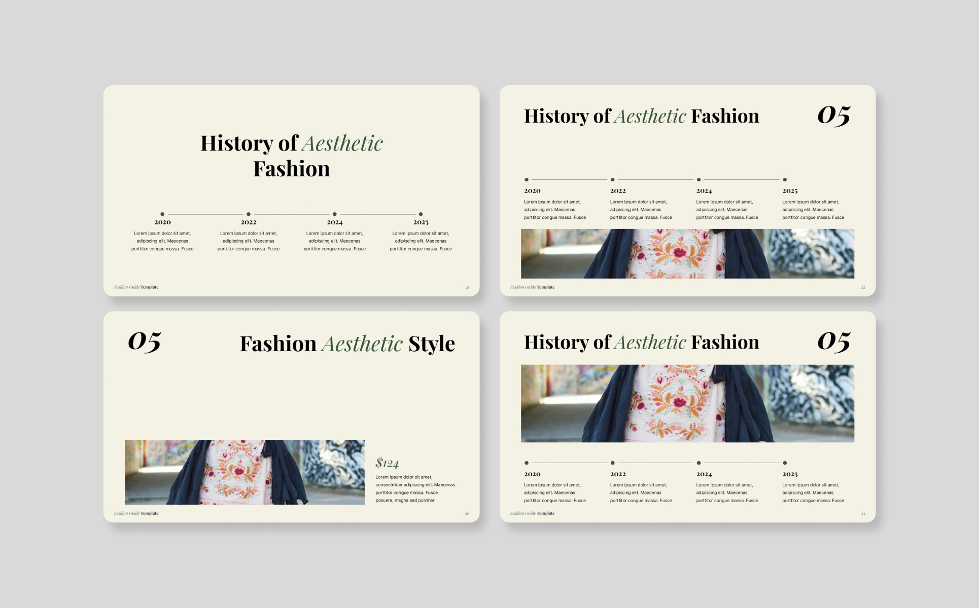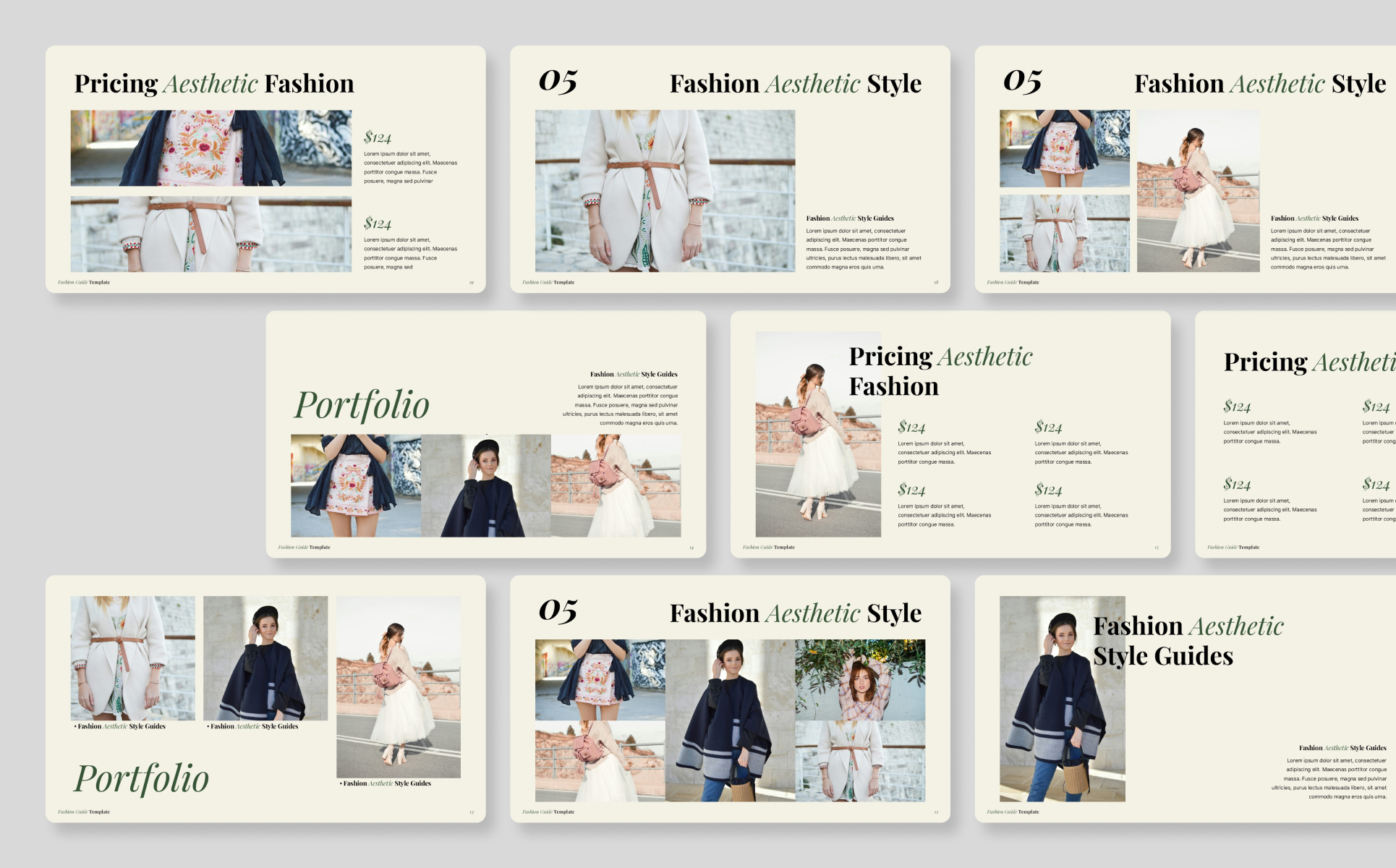 This fashion presentation template includes key sections such as the History of Aesthetic Fashion, Fashion Aesthetic Style, and Portfolio, making it versatile for various creative projects. With a clean and well-structured design, this fashion PowerPoint template ensures that fashion concepts are communicated clearly and engagingly. Additionally, it includes pricing sections to present all aspects of your fashion projects comprehensively.