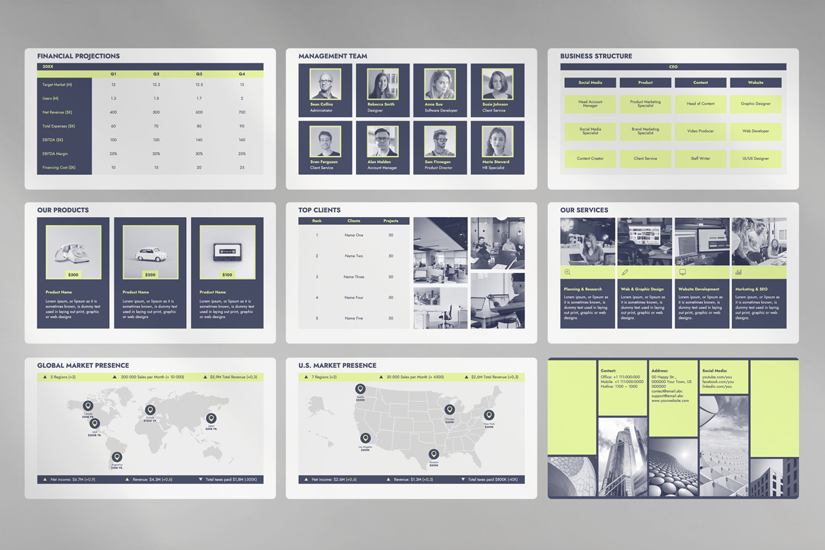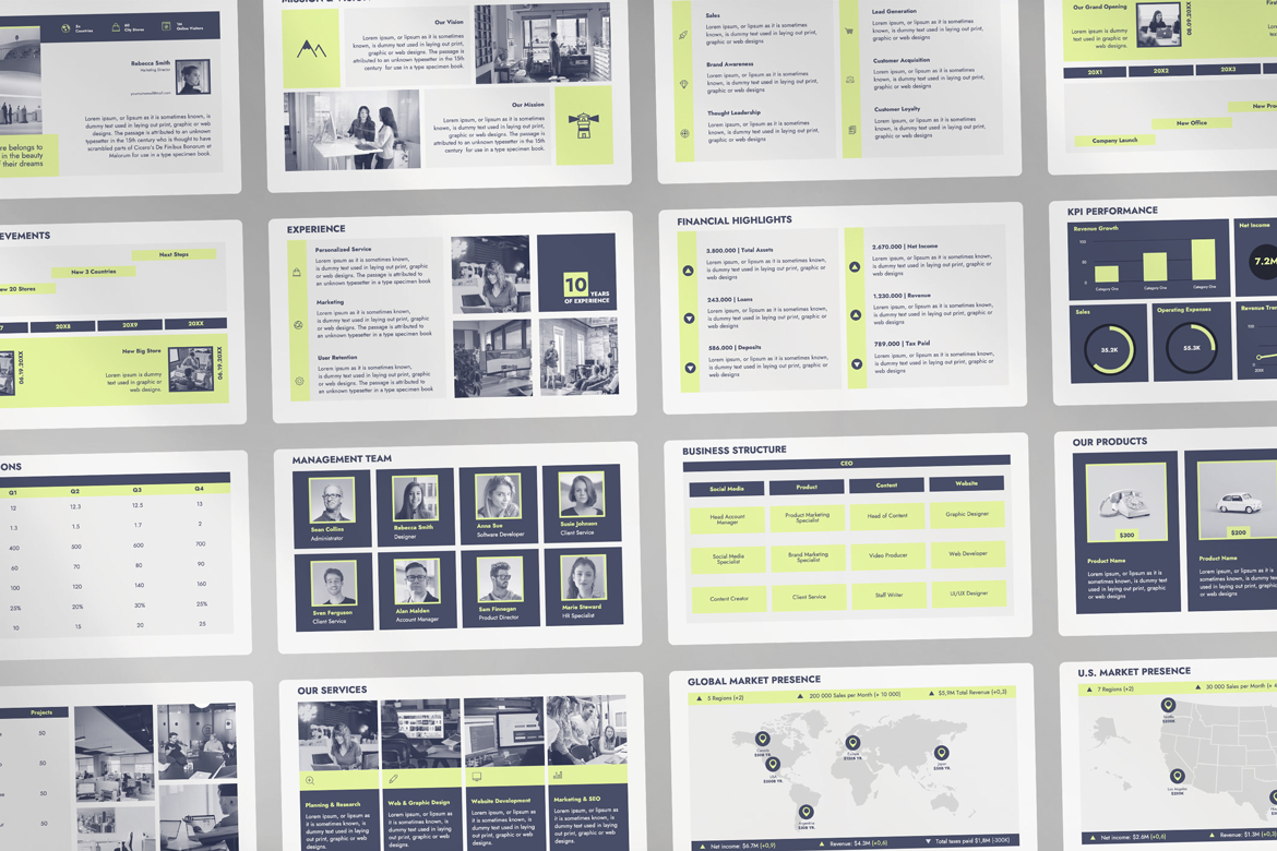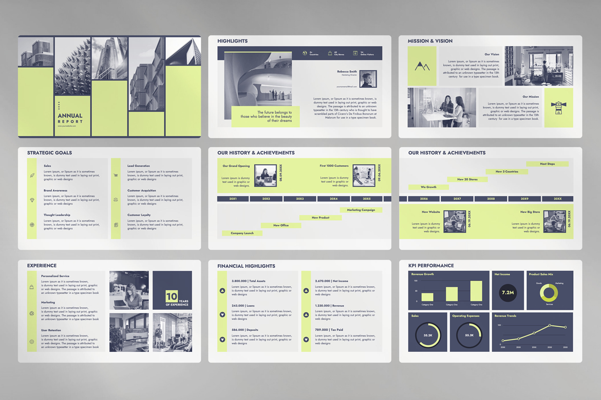 Annual Report is a comprehensive report on corporate activities throughout the preceding year. Annual Report Presentations are intended to give shareholders and other interested people information about the company's activities and financial performance. This presentation template has all the most needed ready-to-use topics such as: Highlights; Mission & Vision; Strategic Goals; Our History & Achievements; Experience; Financial Highlights; KPI Performance; Financial Projections; Management Team; Business Structure; Our Products; Top Clients; Our Services; Global Market Presence; U.S. Market Presence; Contacts
