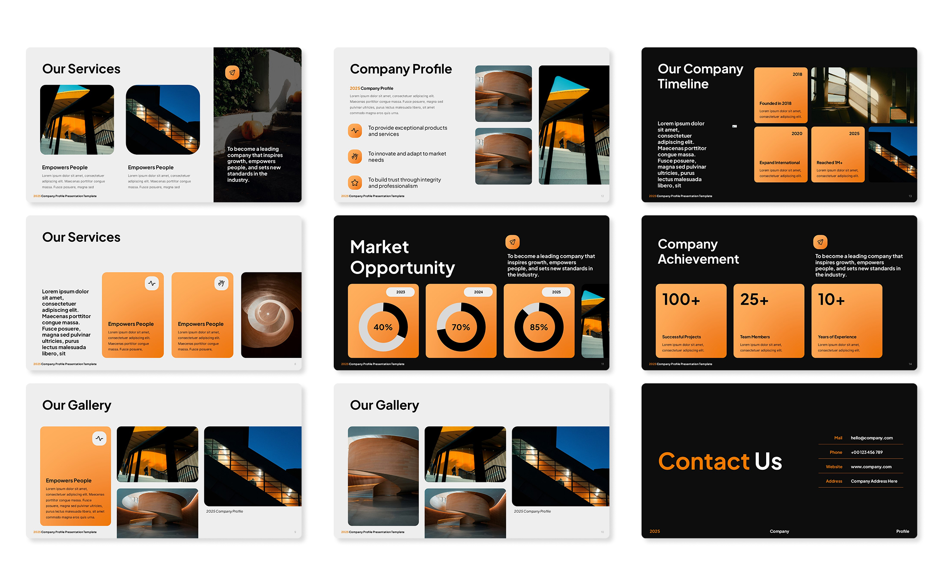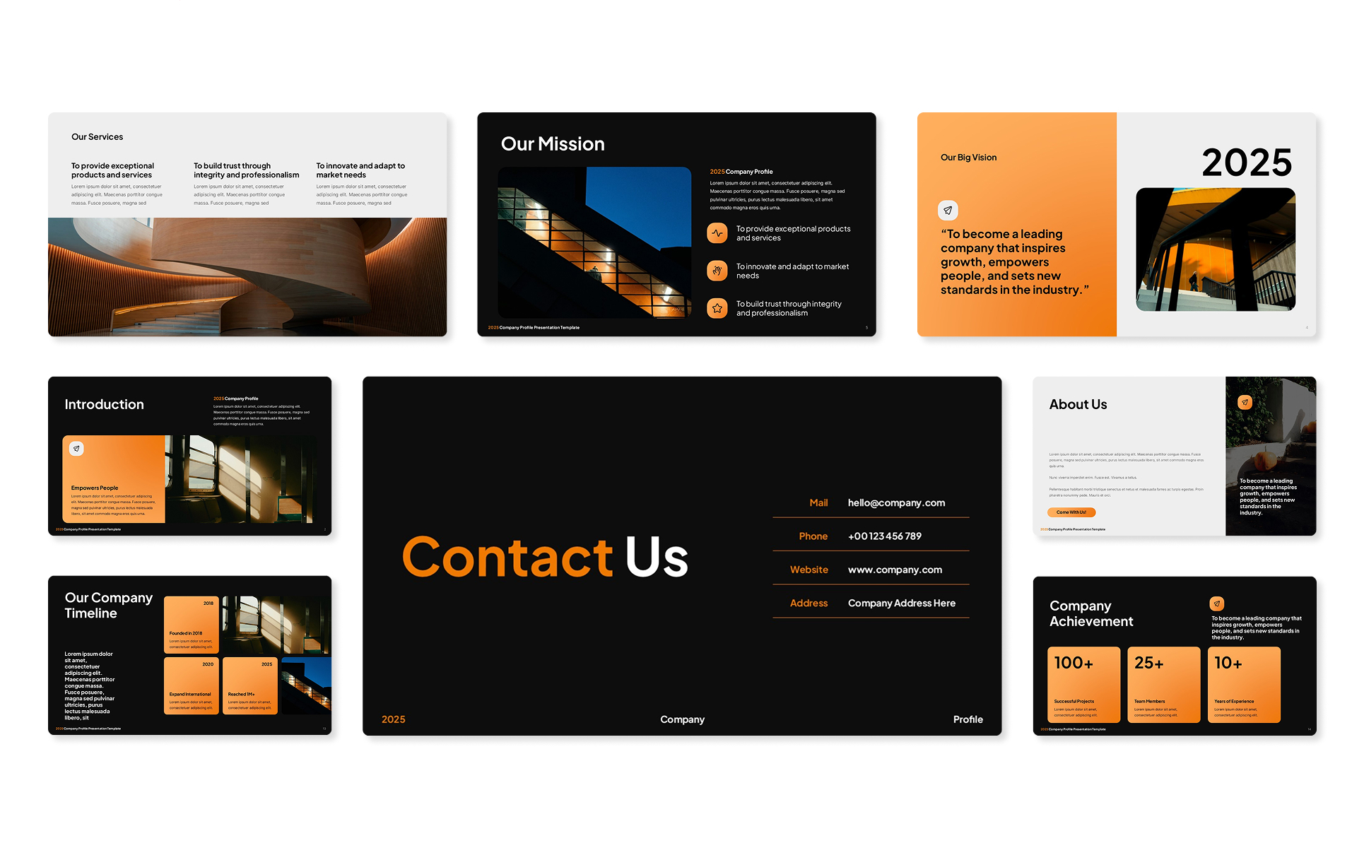 Create a bold and professional company introduction with the Black Orange Company Profile PowerPoint Template — a modern and fully editable presentation deck designed to showcase your business identity, services, achievements, and future plans. With its strong black and orange theme, this template delivers both impact and clarity, making it perfect for corporate, startup, or agency use.