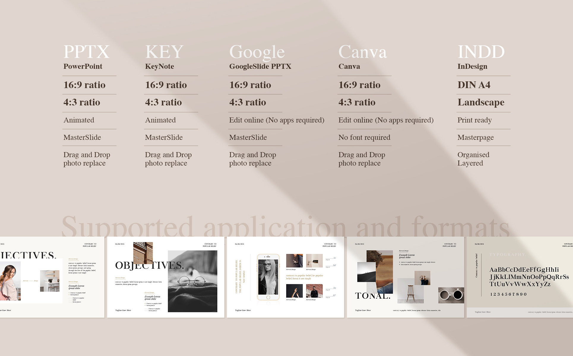 - PPTX, KEY, INDD, Canva and GoogleSlide formats