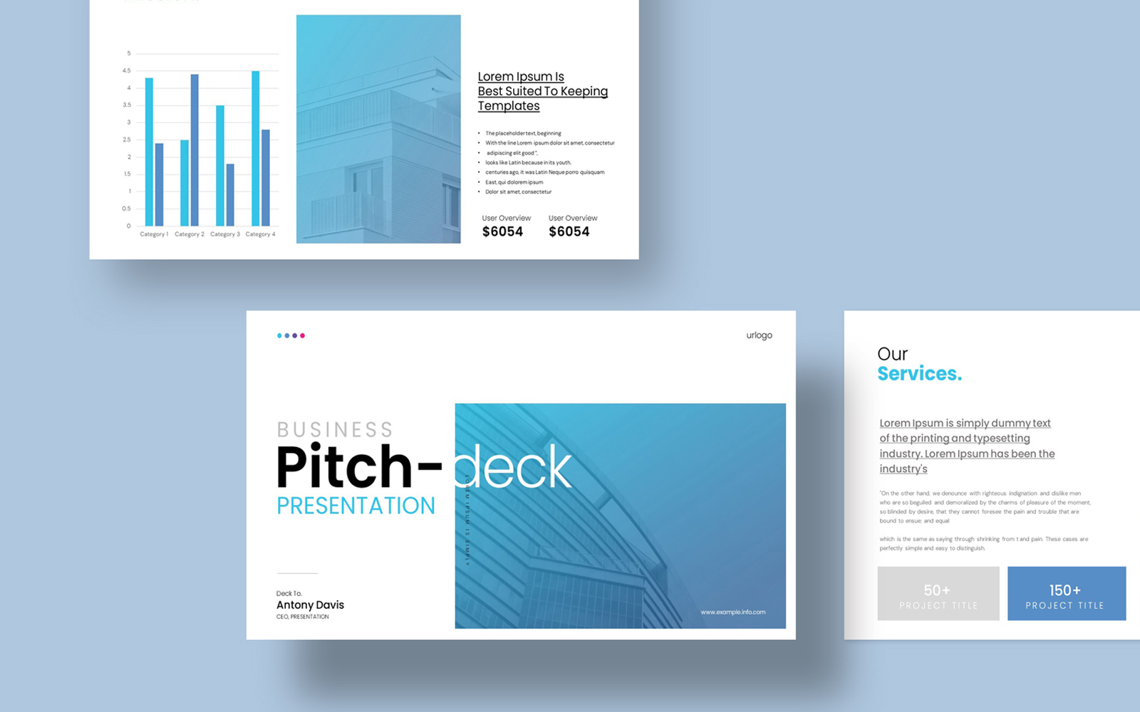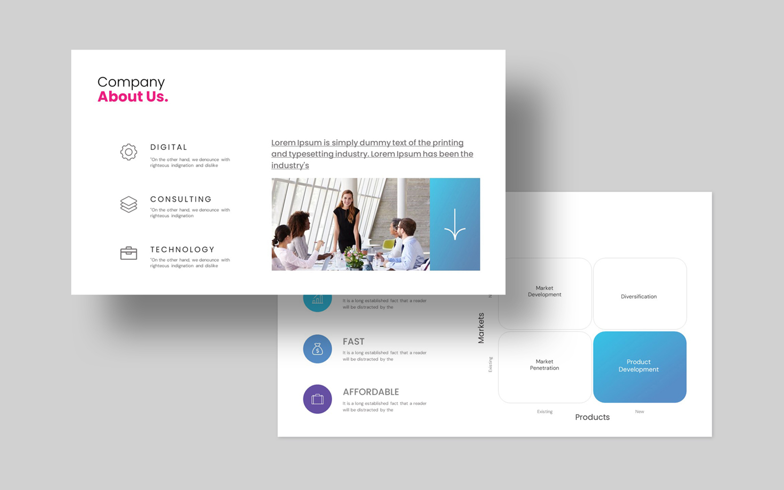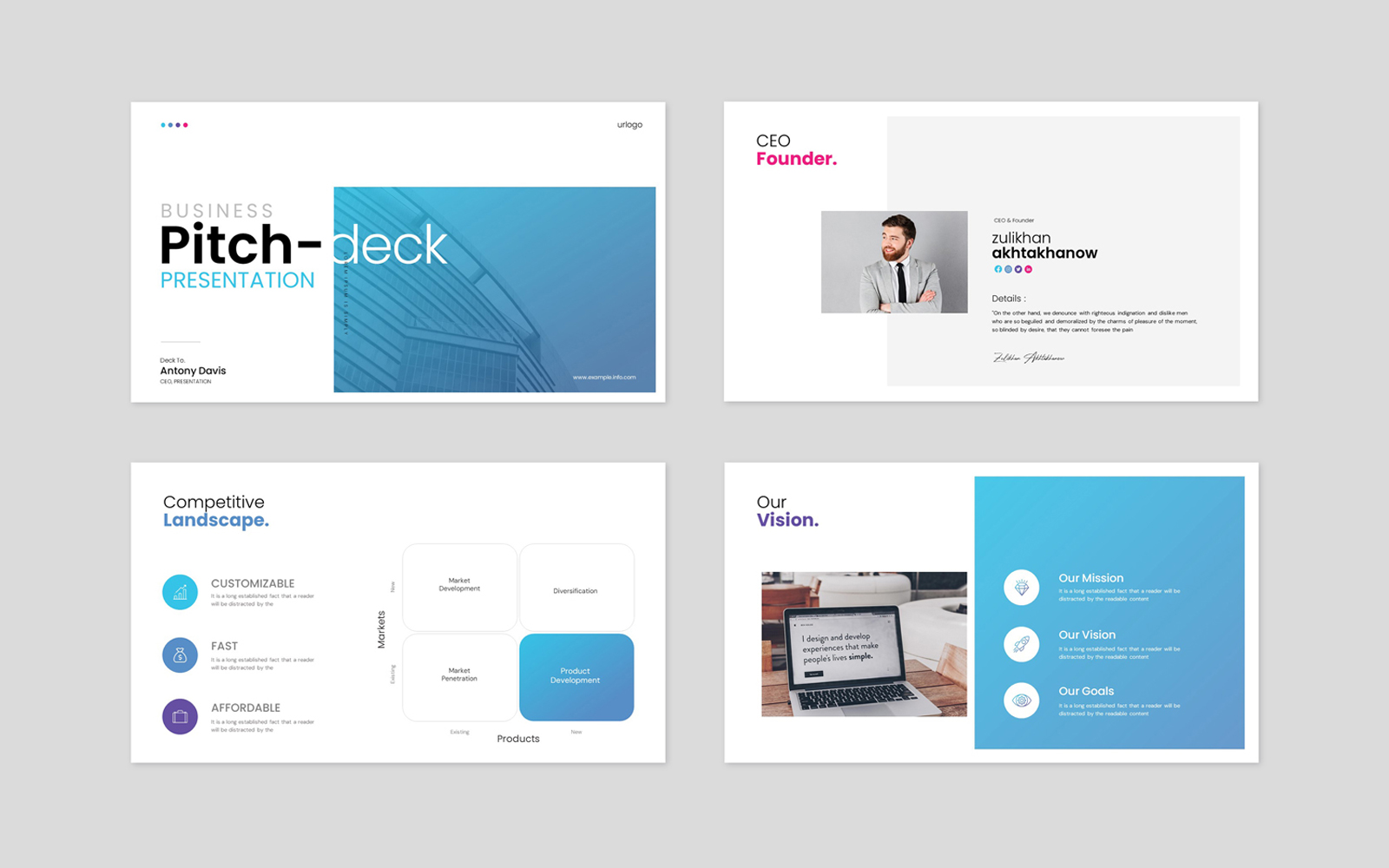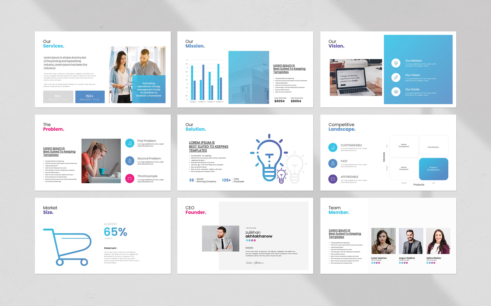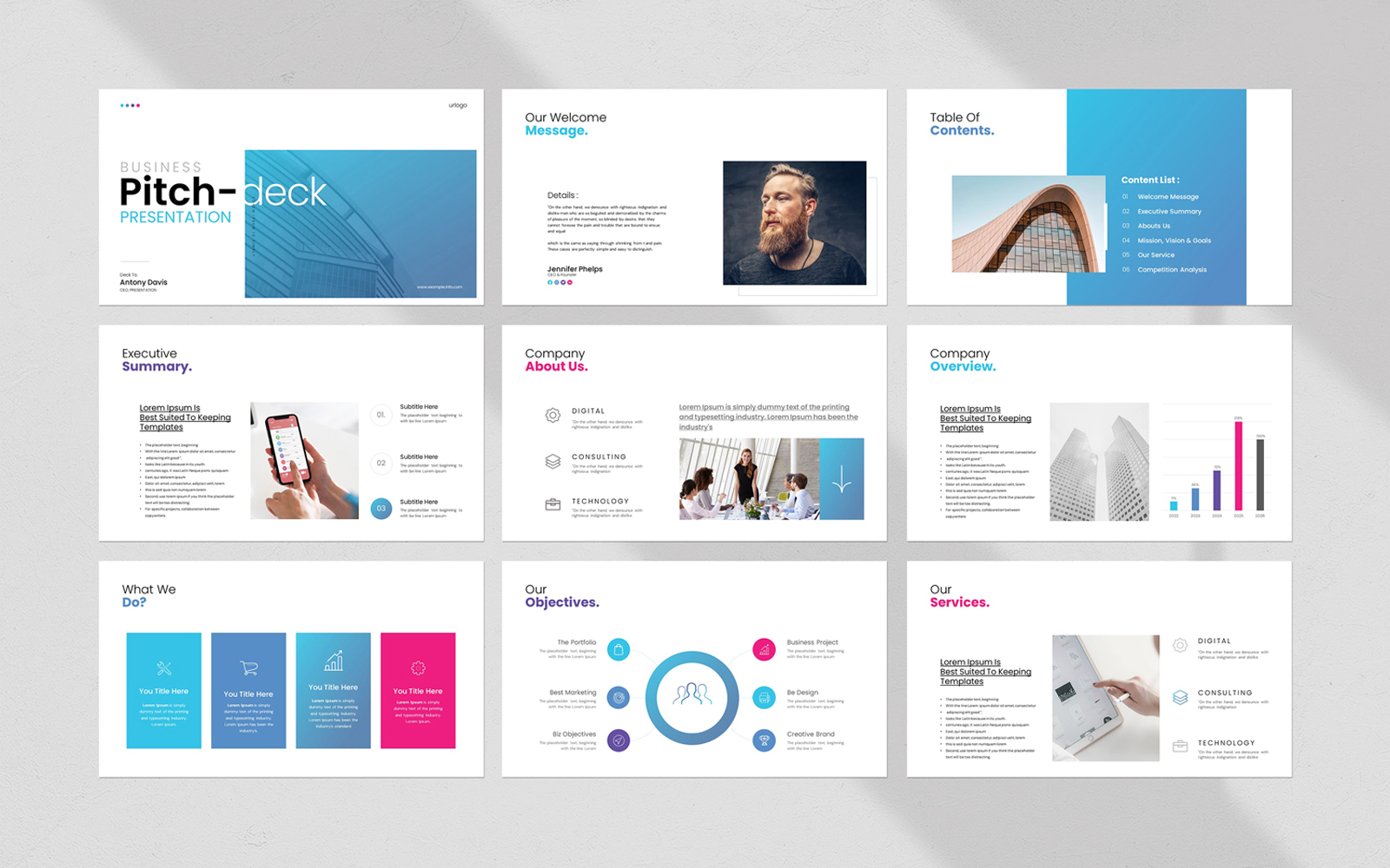 Present your works in a professional and clean way with Business Pitch Deck Presentation Template. This is a simple contemporary but powerful design that includes creative photo layouts, infographics, tables, vector icons, diagrams and tons of great features to show your work and your company profile on another level.