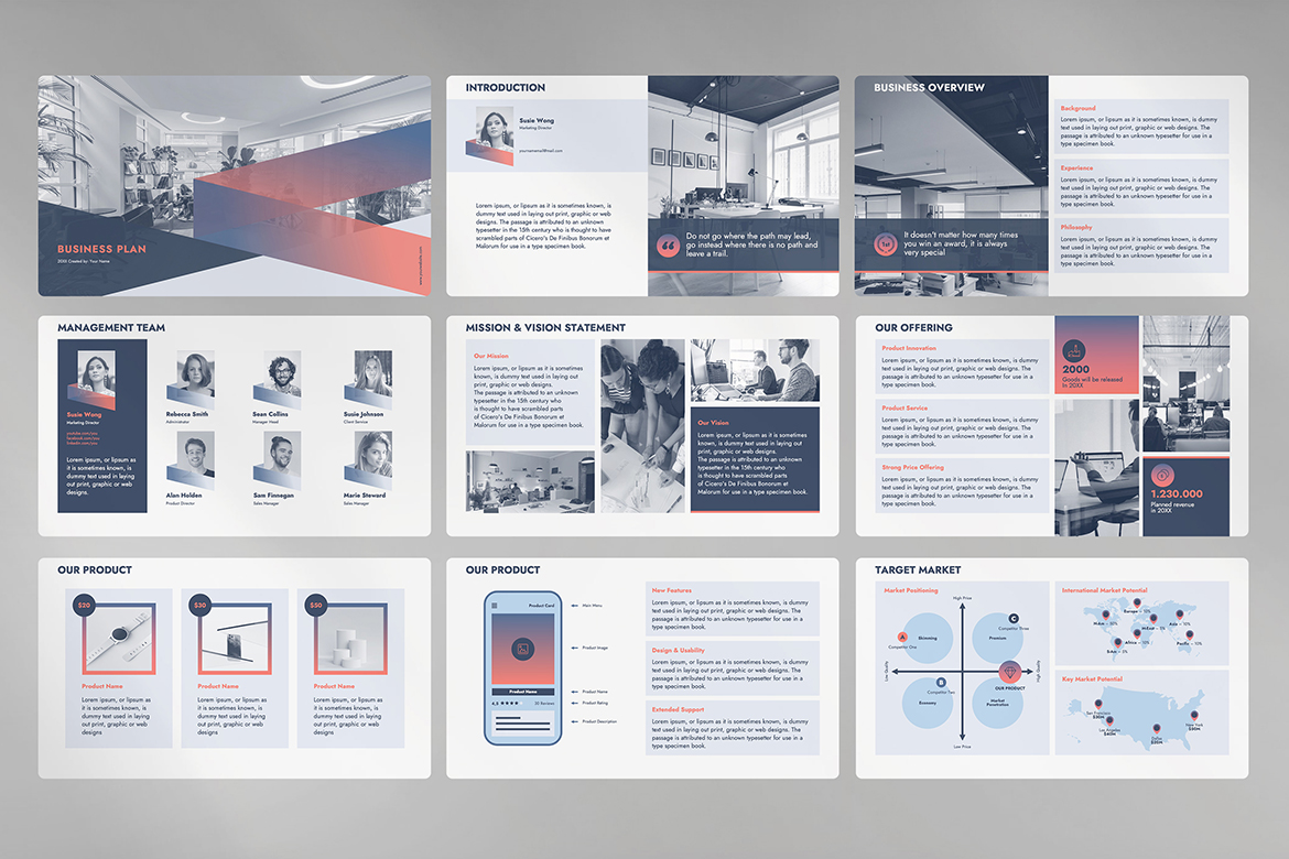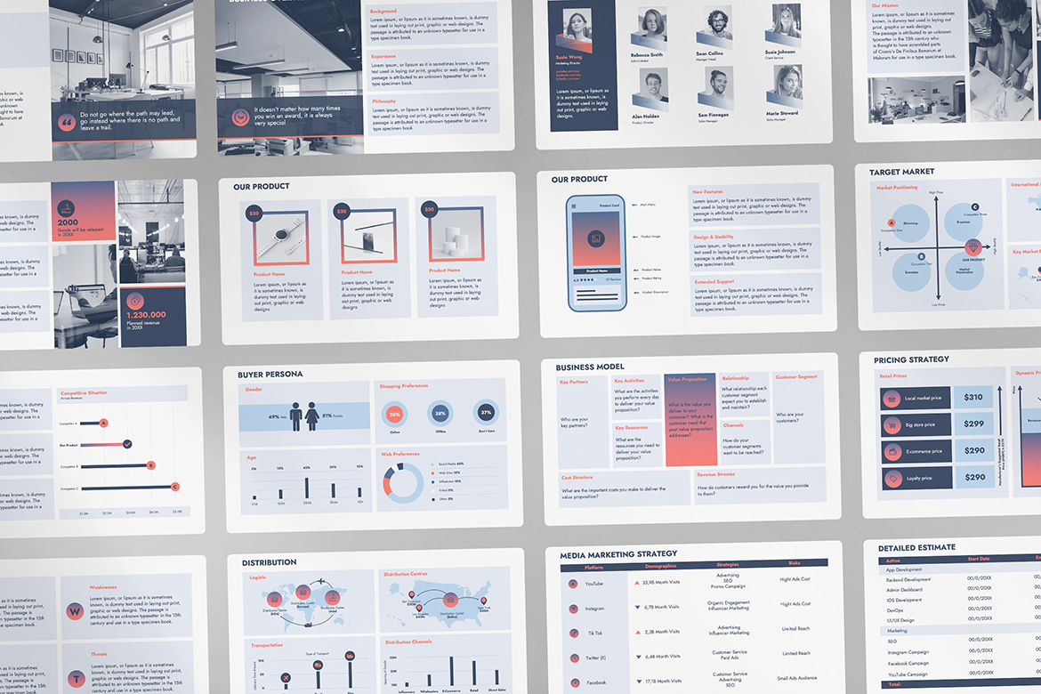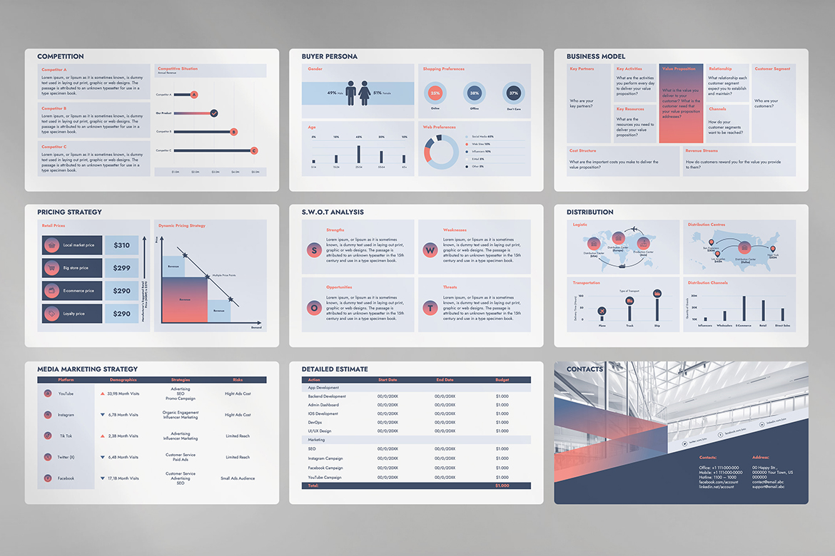 Try this helpful and comprehensive Business Plan presentation template based on successful samples. Big typefaces and calm color schemes will allow your client to focus on your data and final analysis. You can also use this template in business and marketing proposals, analyses, and research. This presentation template has all the most needed ready-to-use topics such as: Introduction, Business Overview; Management Team; Mission & Vision Statement; Our Offering; Our Product; Target Market; Competition; Customer Overview; Business Model; Pricing Strategy; S.W.O.T Analysis; Product Distribution; Media Marketing Strategy; Detailed Estimate; Contacts
