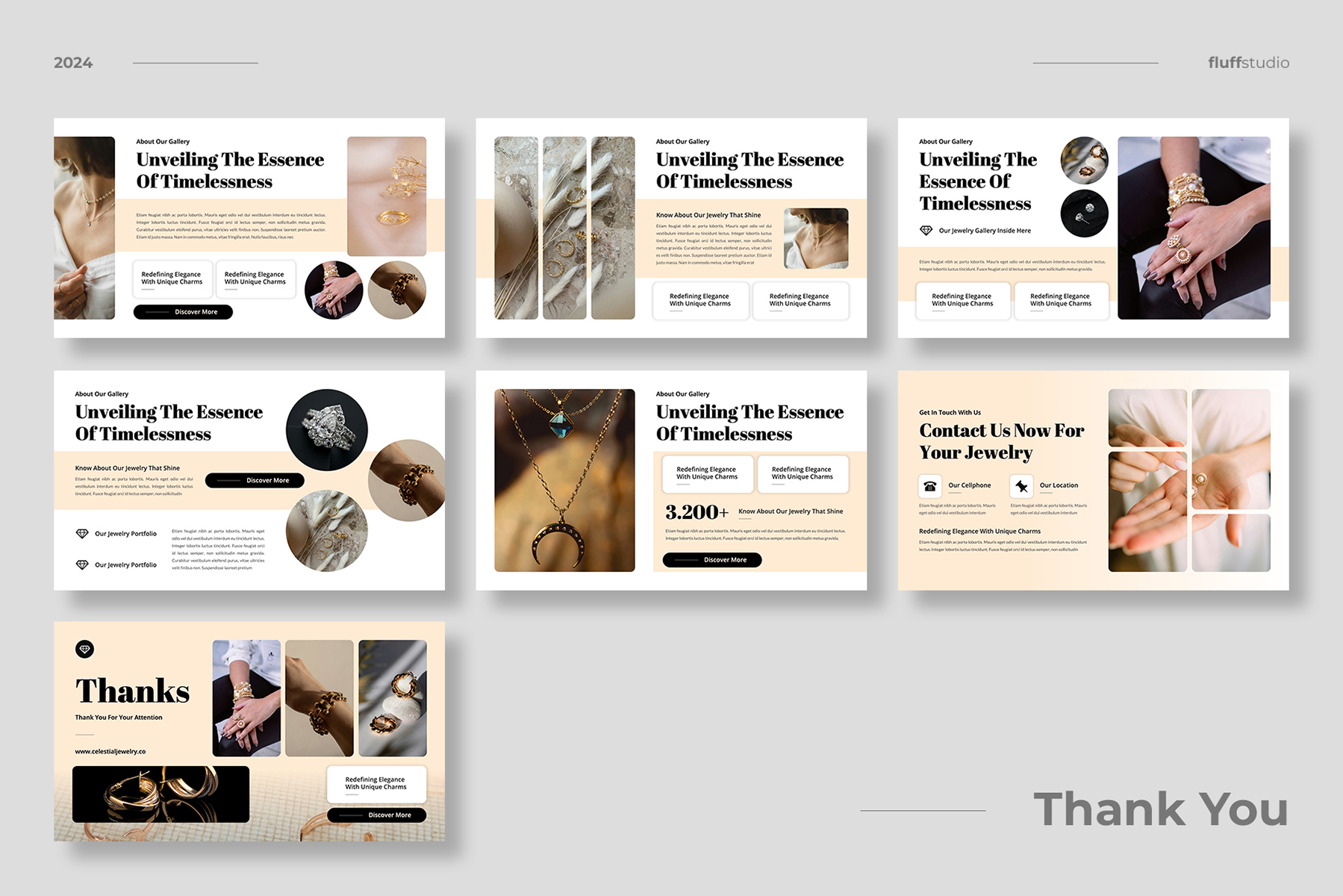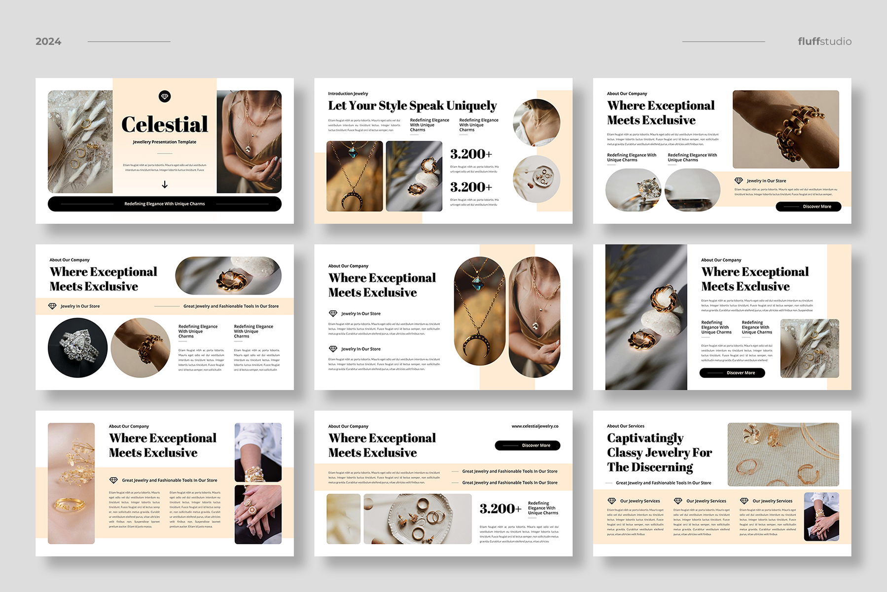 Perfect for luxury jewelry brand, women fashion store, gold & silver jewelry craftsmen, project proposal, startup pitch deck, company profile, marketing kit, etc.
