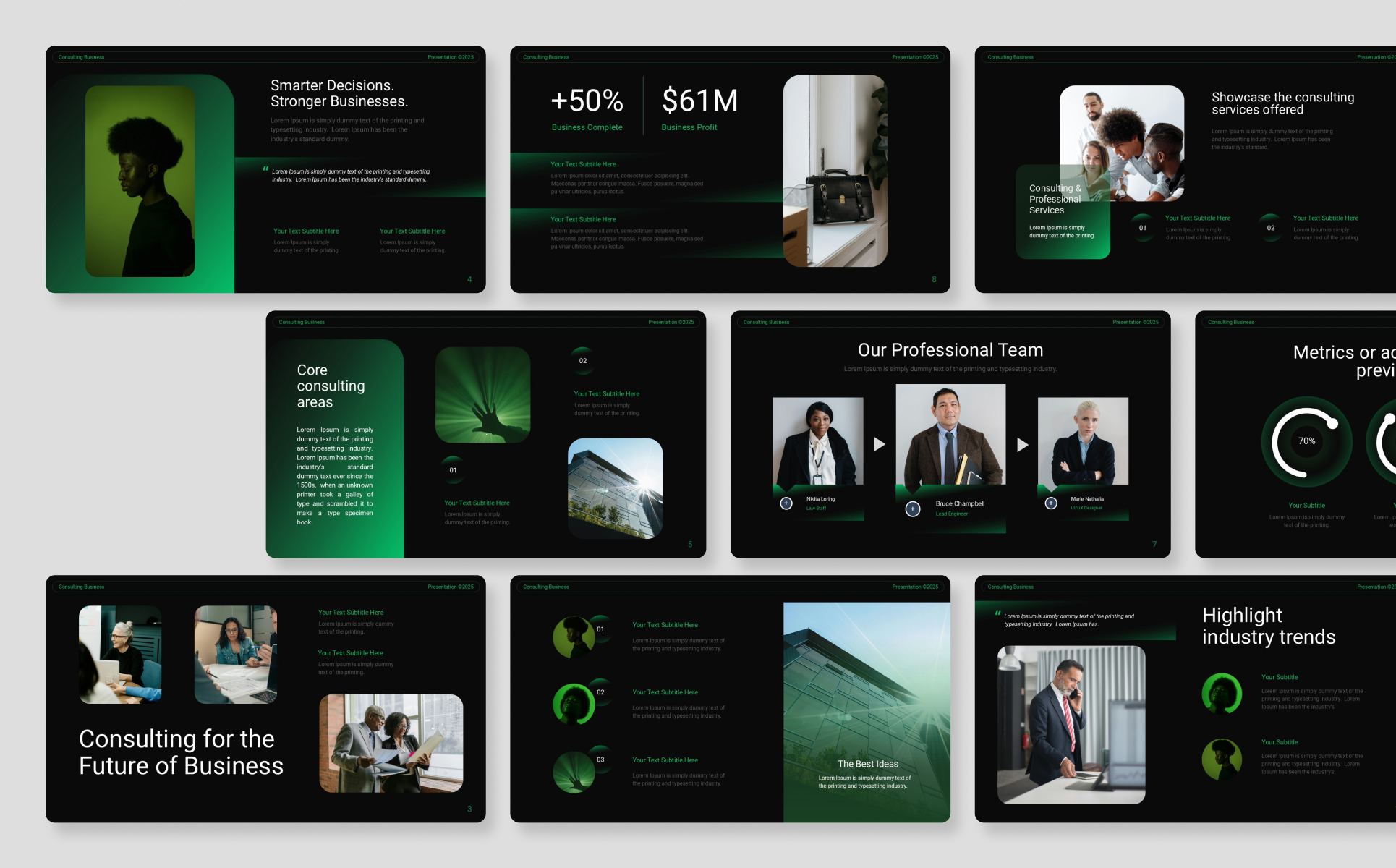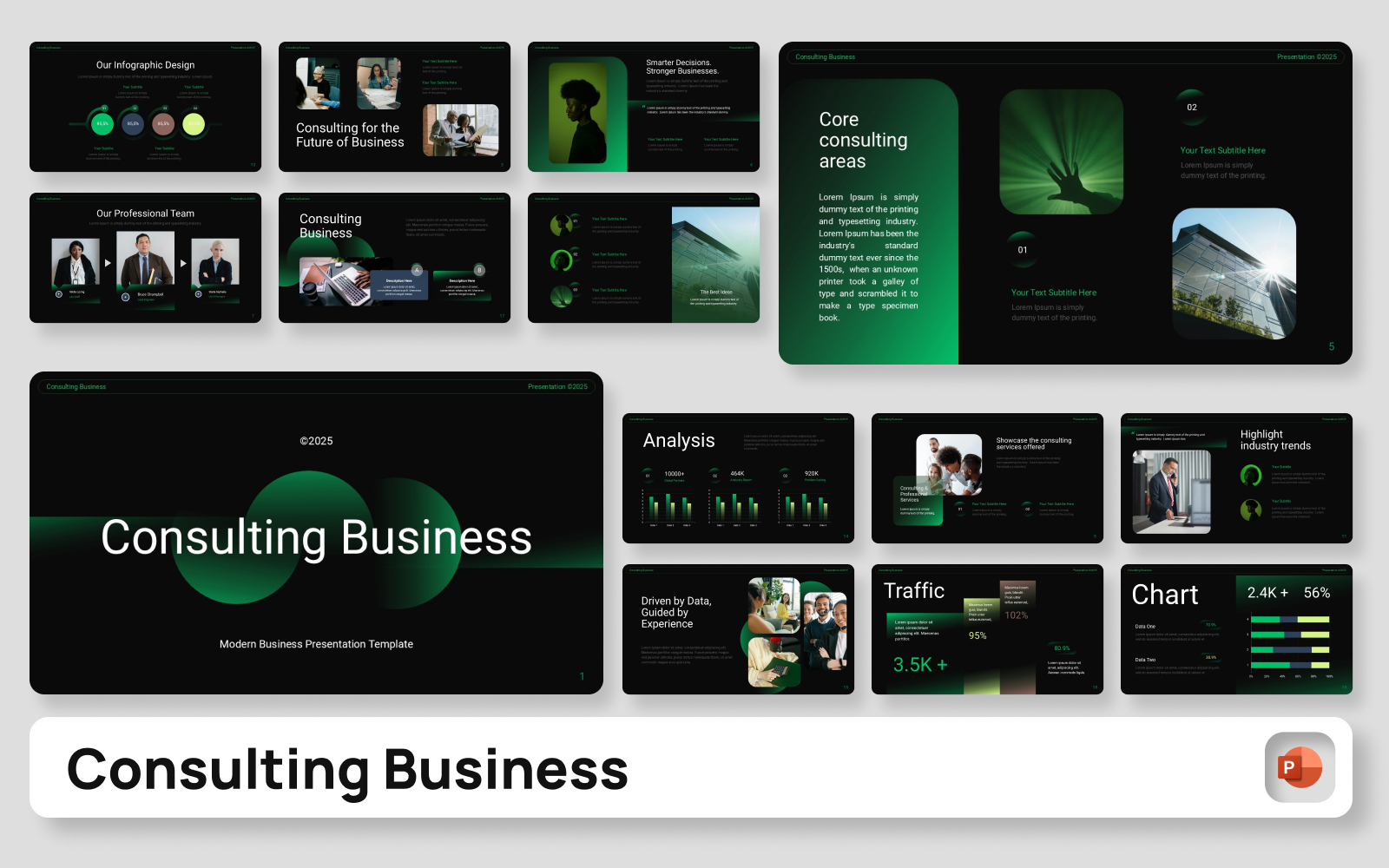 Showcase your expertise and professionalism with the Consulting Business PowerPoint Presentation Template — designed to help consultants and corporate professionals deliver strategic ideas with impact. Featuring a clean, modern design and balanced layouts, this template makes it easy to present business analyses, project insights, and growth strategies in a visually compelling way.