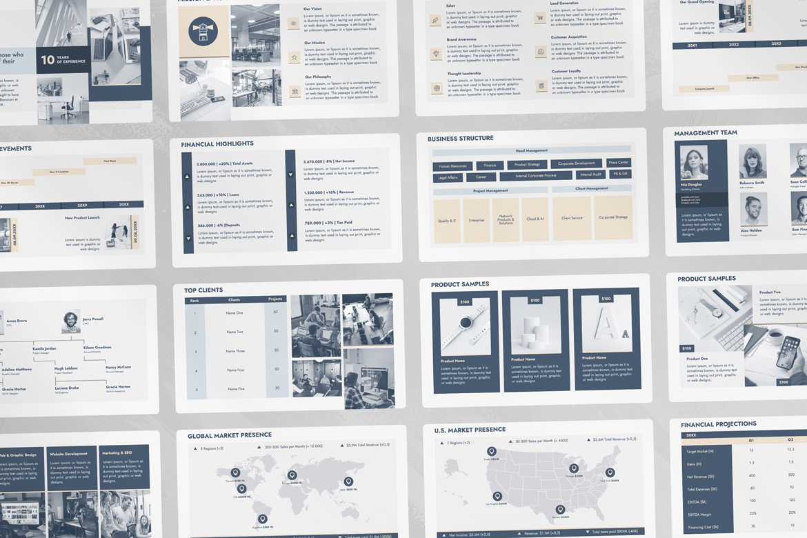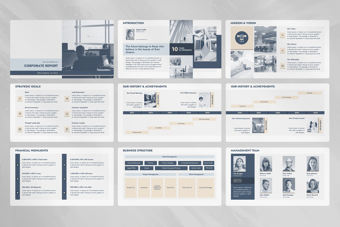 Corporate reporting means reporting financial and non-financial data to stakeholders. These reports can take many forms, depending on their goal, including audit reporting, financial reporting, corporate governance and responsibility reporting, and more. This presentation template has all the most needed ready-to-use topics, such as: Introduction; Mission & Vision; Strategic Goals; Our History & Achievements; Financial Highlights; Business Structure; Management Team; Team Structure; Top Clients; Product Samples; Our Services; Global Market Presence; U.S. Market Presence; Financial Projections