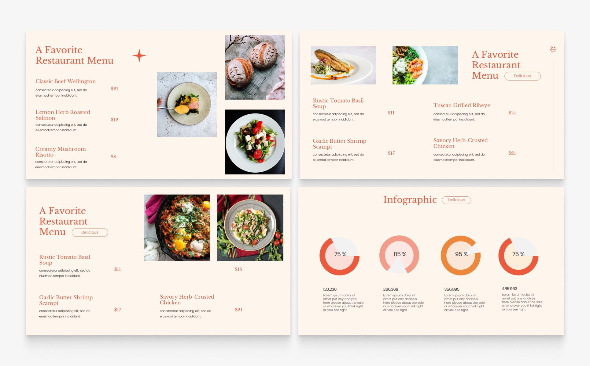 Cream Minimalist Restaurant Presentation Template is a professional, modern presentation template designed to make your next pitch stand out. Its clean and minimalist design ensures your message is communicated with style, clarity, and impact.