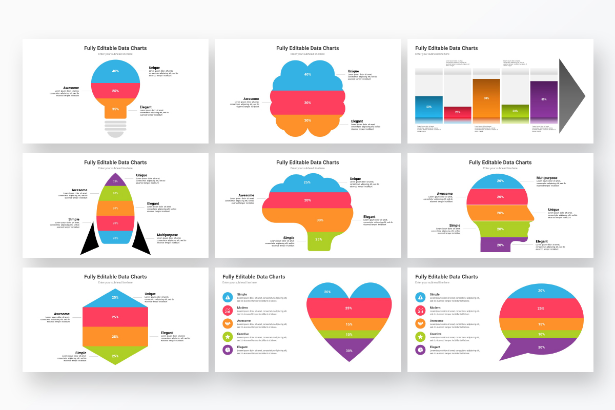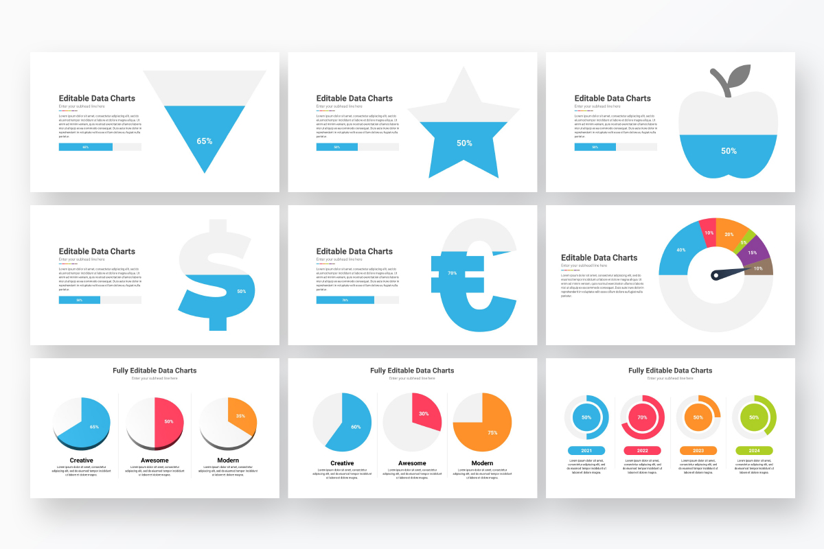 The Editable Data Charts Template has 63 unique slides of content. fully editable via Excel, All objects are vector objects, and they are fully editable, all icons used are vectors which means you can easily change their size and colors to any size you want without losing resolution.