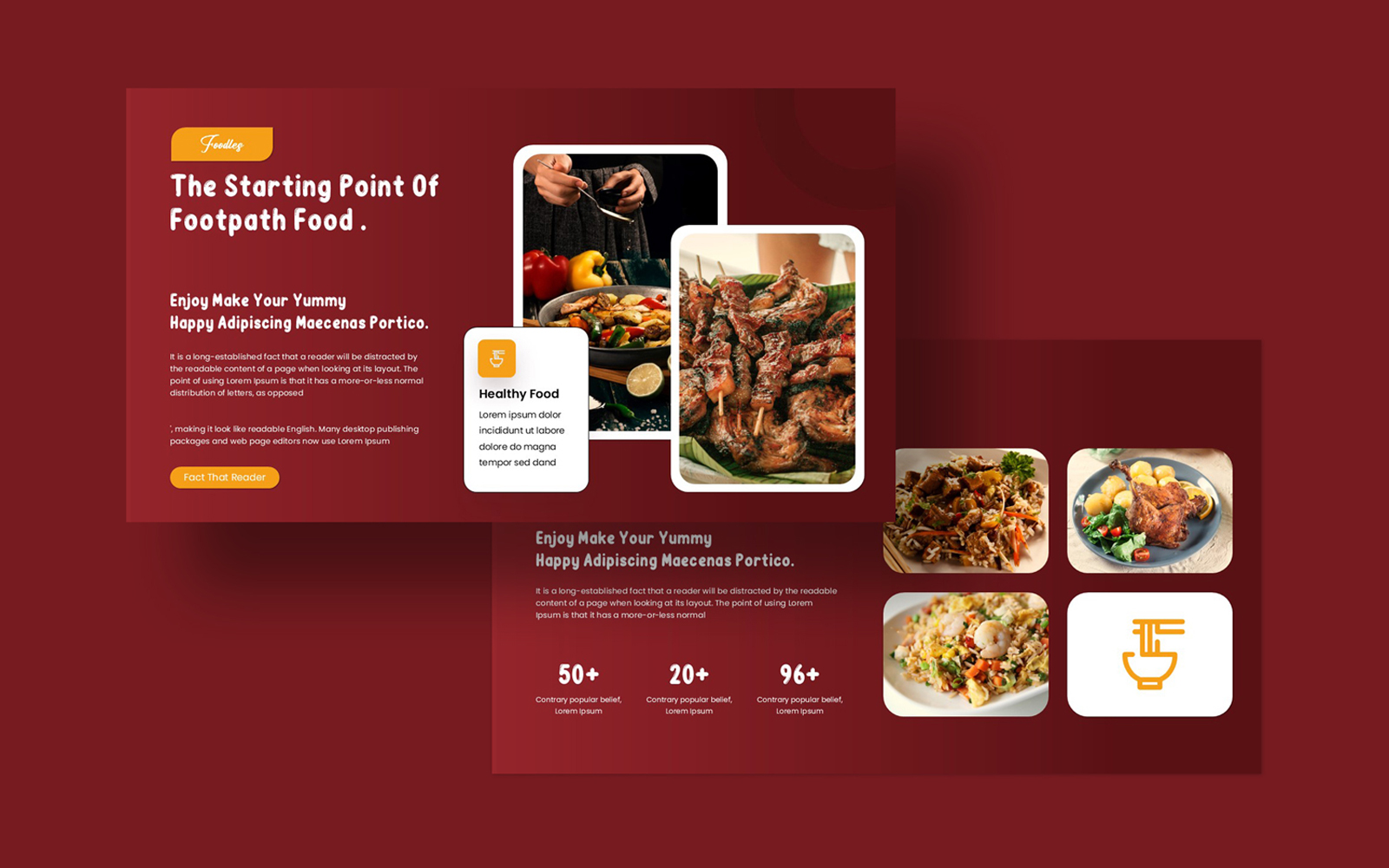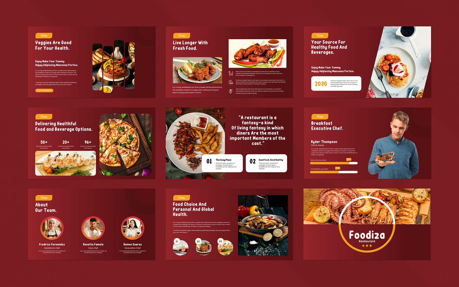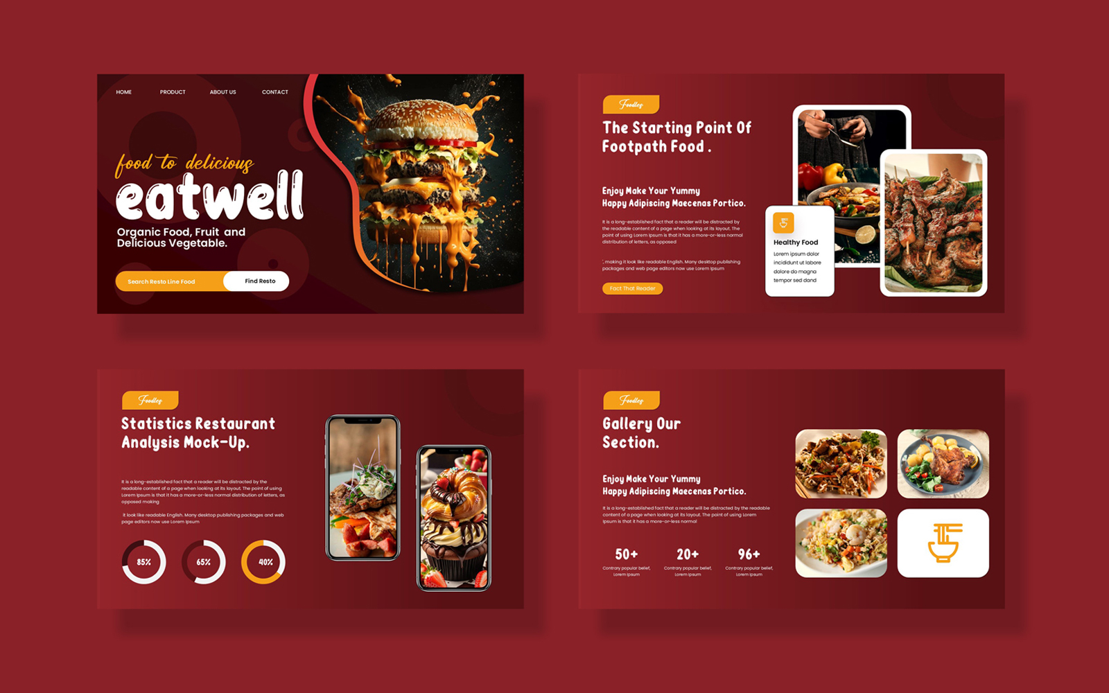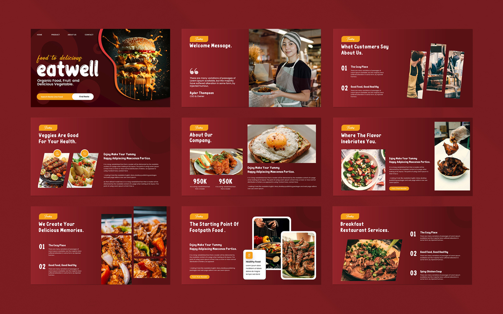 Present your works in a professional and clean way with Eatwell Food Presentation Template. This is a simple contemporary but powerful design that includes creative photo layouts, infographics, tables, vector icons, diagrams and tons of great features to show your work and your company profile on another level.