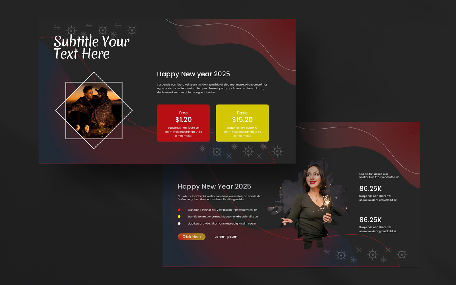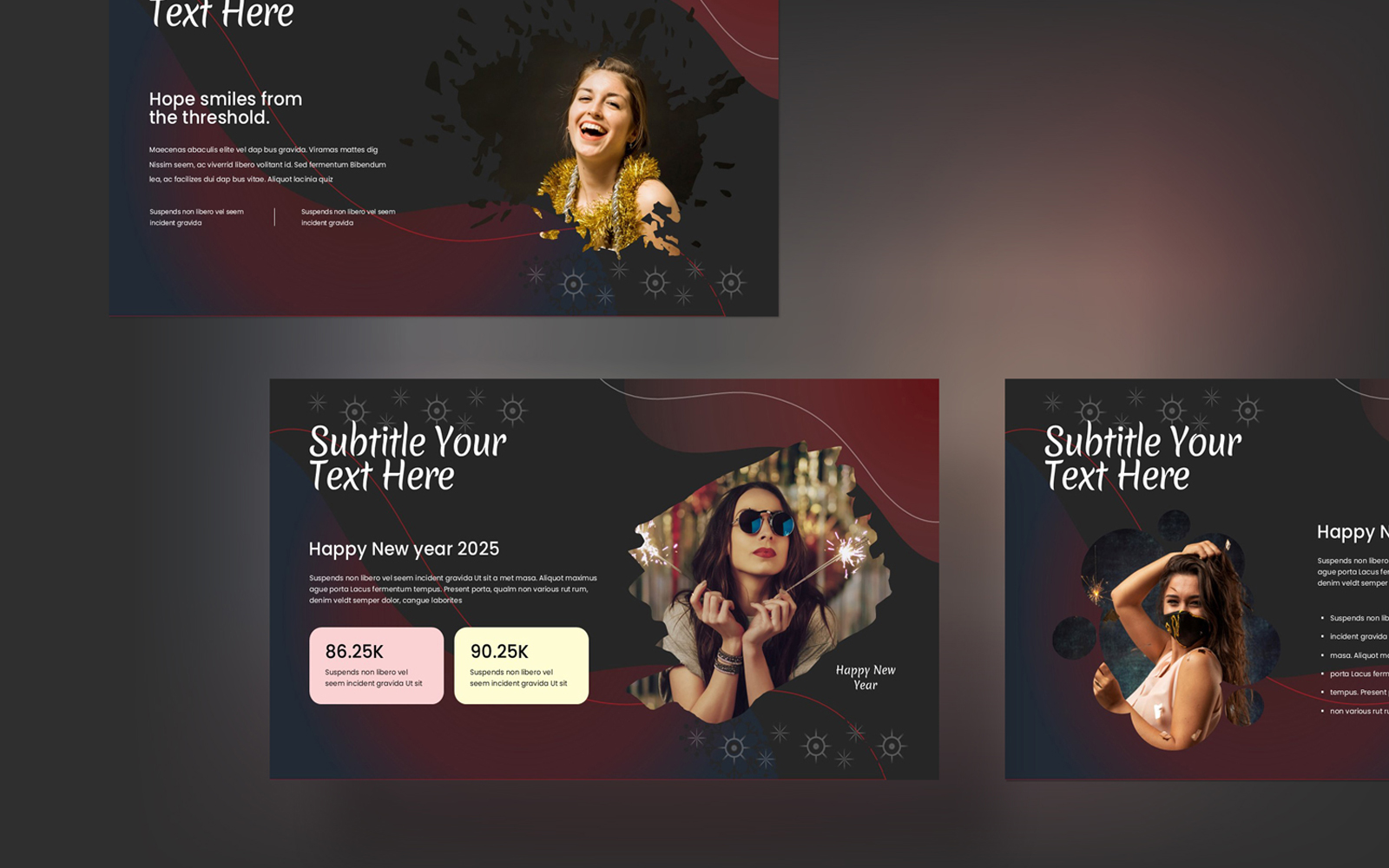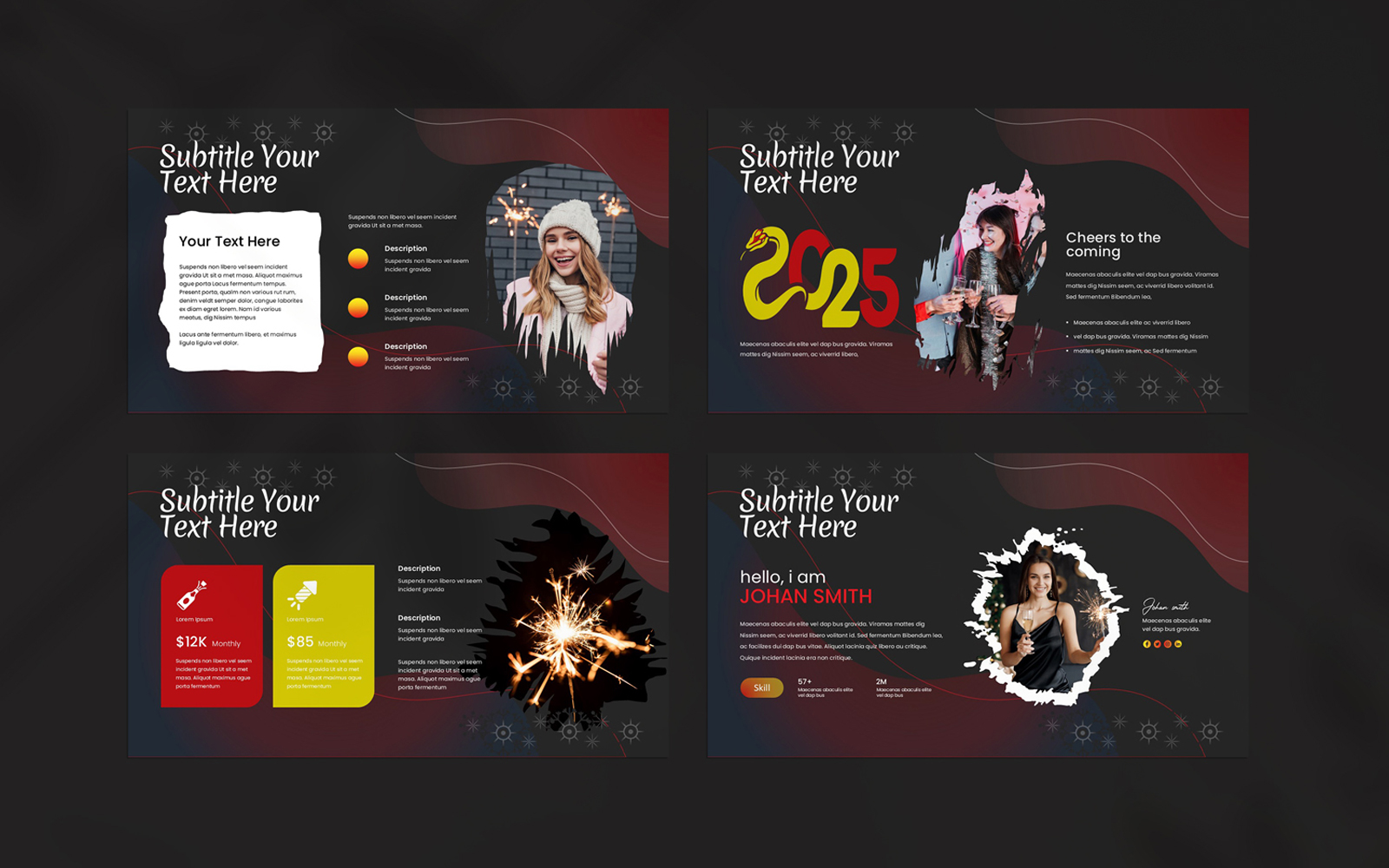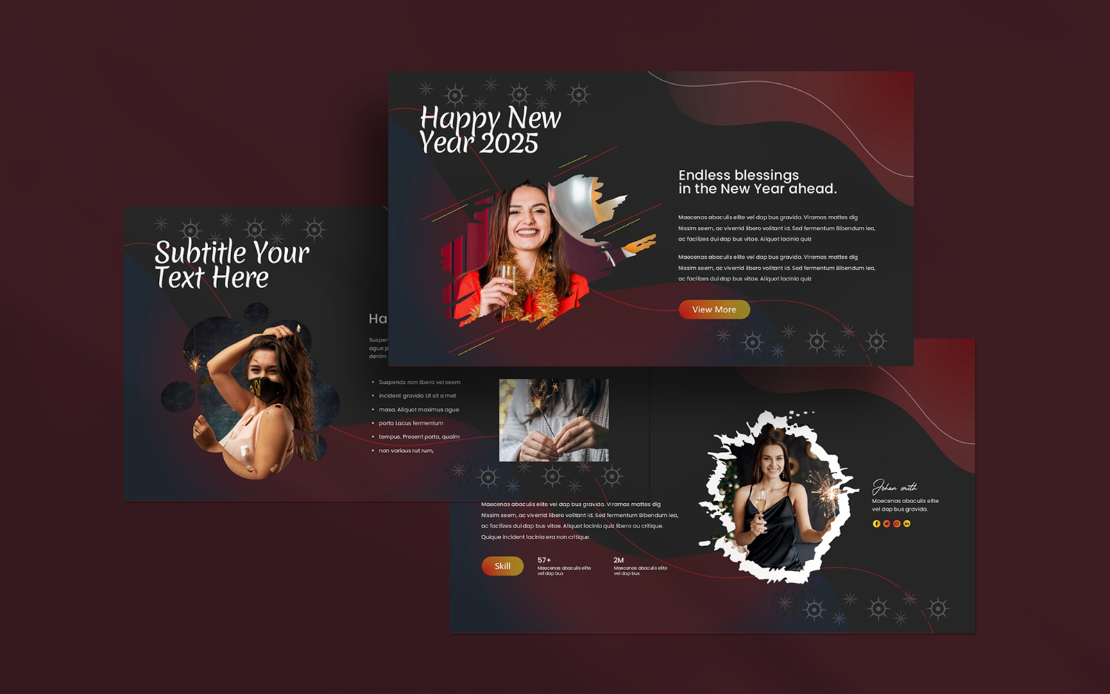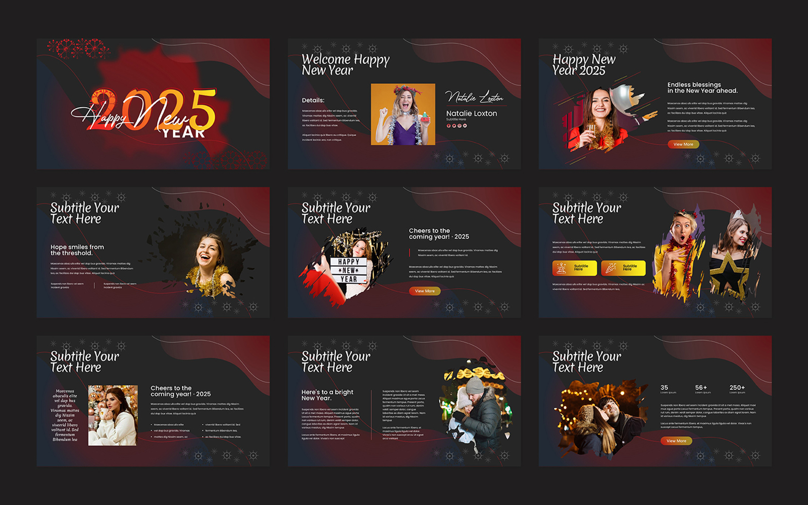 Present your works in a professional and clean way With Happy New Year Presentation Template. This is a simple contemporary but powerful design that includes creative photo layouts, infographics, tables, vector icons, diagrams and tons of great features to show your work and your company profile on another level.