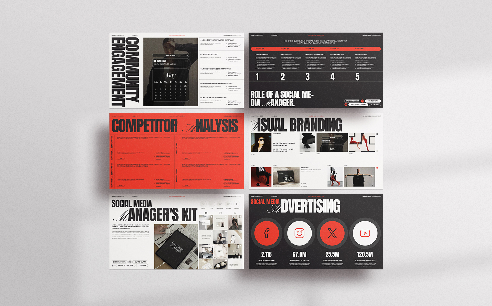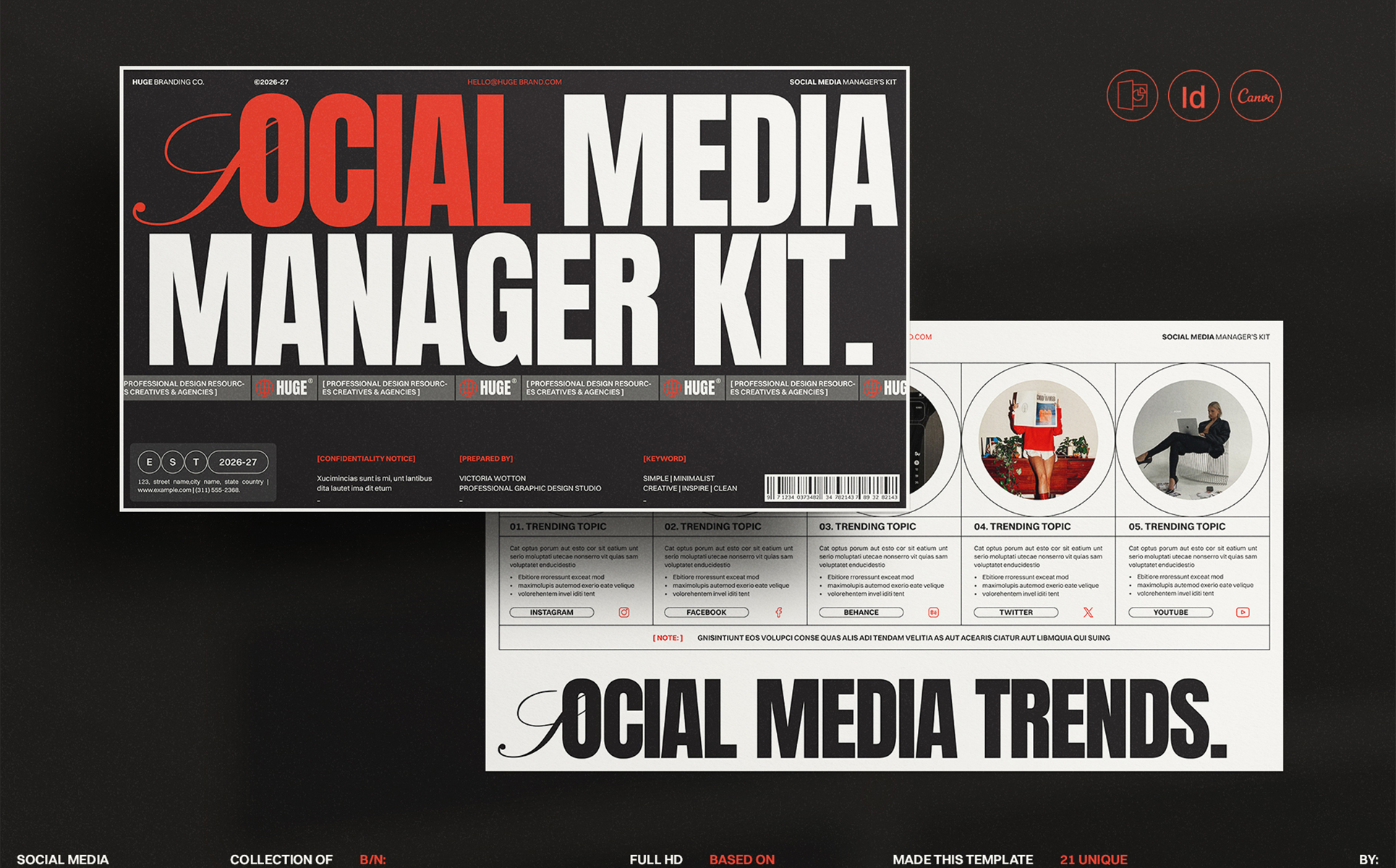 The Social Media Manager's Kit Presentation is a 21 fully customizable layout design templates for Adobe InDesign, PowerPoint & CANVA. It's made specifically for Social media managers, marketers, and strategists.