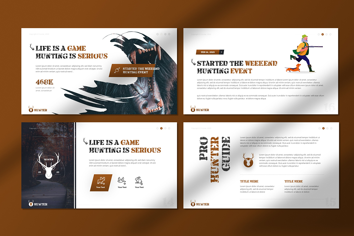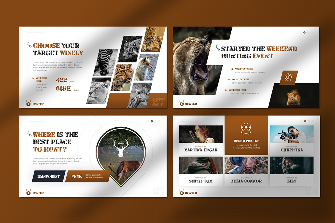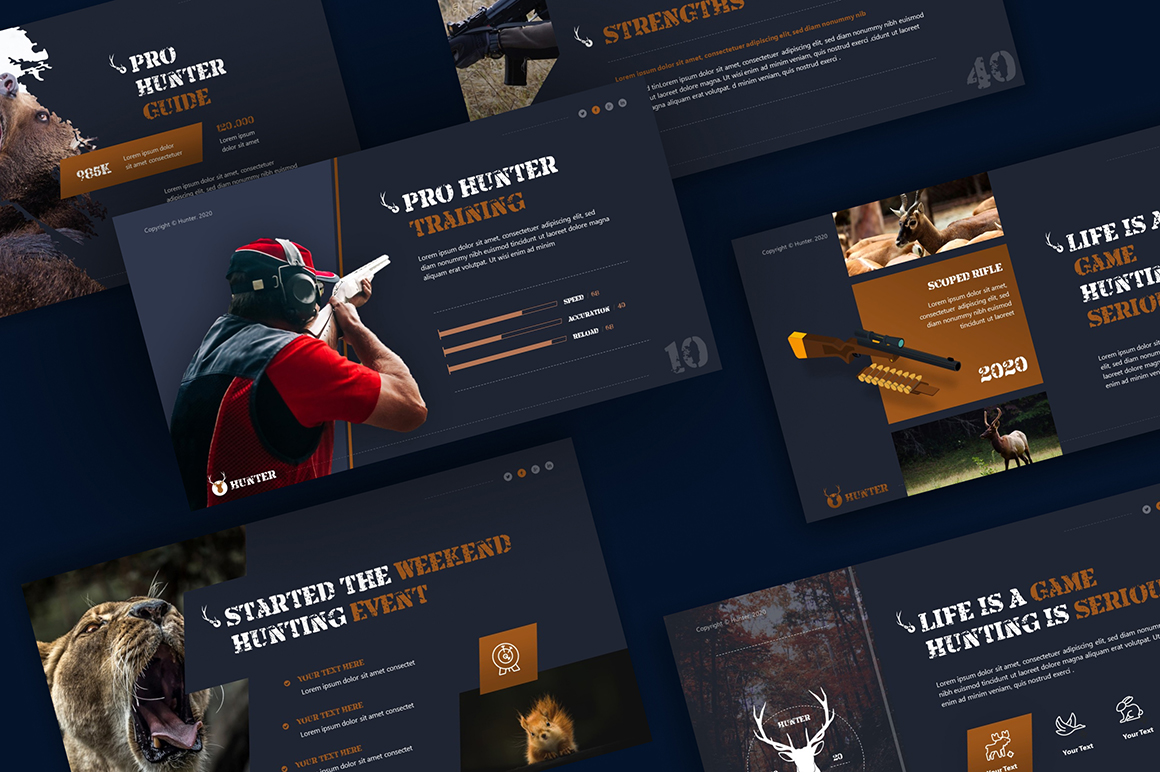 Hunter Hunting PowerPoint Template is very suitable for you to plan your business in producing textiles, wool, and way more by hunting the animals. Hunting is a very famous race to which people have often altered into a hobby. Several foreign tourists come for hunting with guided tours or as independent hunters. Many common animals are tigers, rhinoceros, deer, and other wild animals. What is the best part? Yeah, we can redesign this presentation template quickly. We just have to download it, edit the content, and wow our audiences. Most surprisingly, all the design elements like typefaces, icons, charts, diagrams, and other visuals are customizable to perfect this powerful presentation.