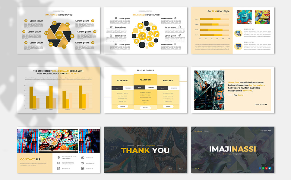 Imajinassi – Creative Business PowerPoint Template is a powerpoint template that can be used for any type of presentation: Business, Portfolio, Company, Photography, Company Profile, Creative Agency, Costum Production, and can also be used for Personal Portfolios.