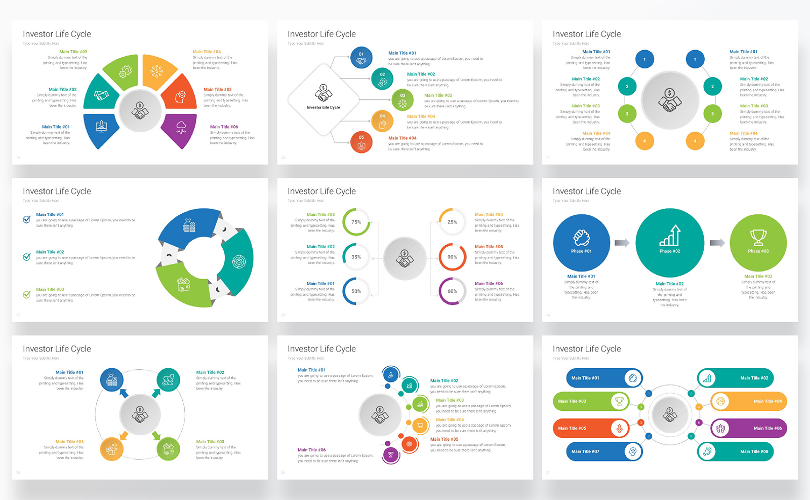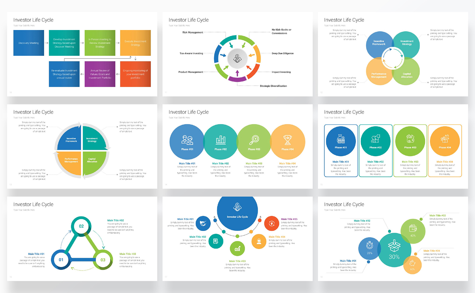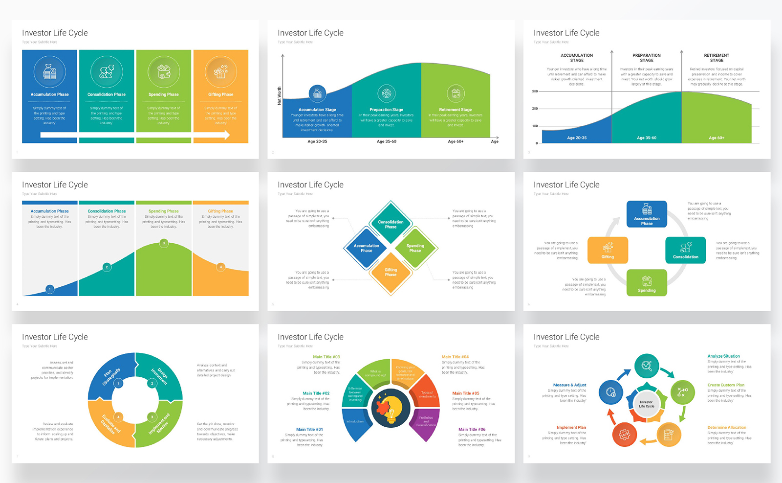 With strategically designed slides, these templates empower presenters to explore topics such as risk assessment, asset allocation, market analysis, and strategic planning, enabling the audience to grasp the nuances of investor behavior and strategy evolution. Whether used for educational purposes, financial presentations, or investment workshops, these templates serve as a powerful tool to enhance comprehension of the intricate Investor Life Cycle.
