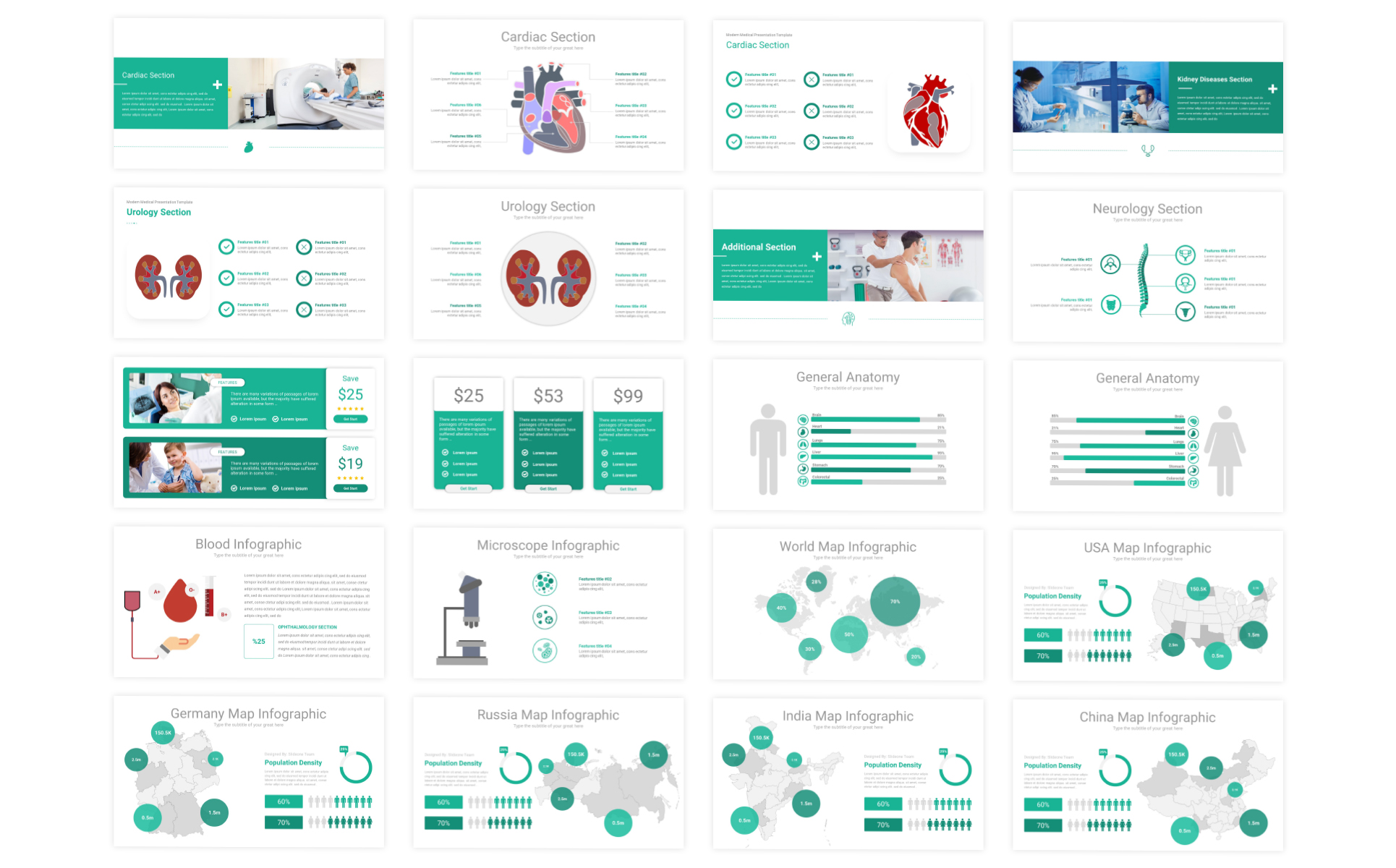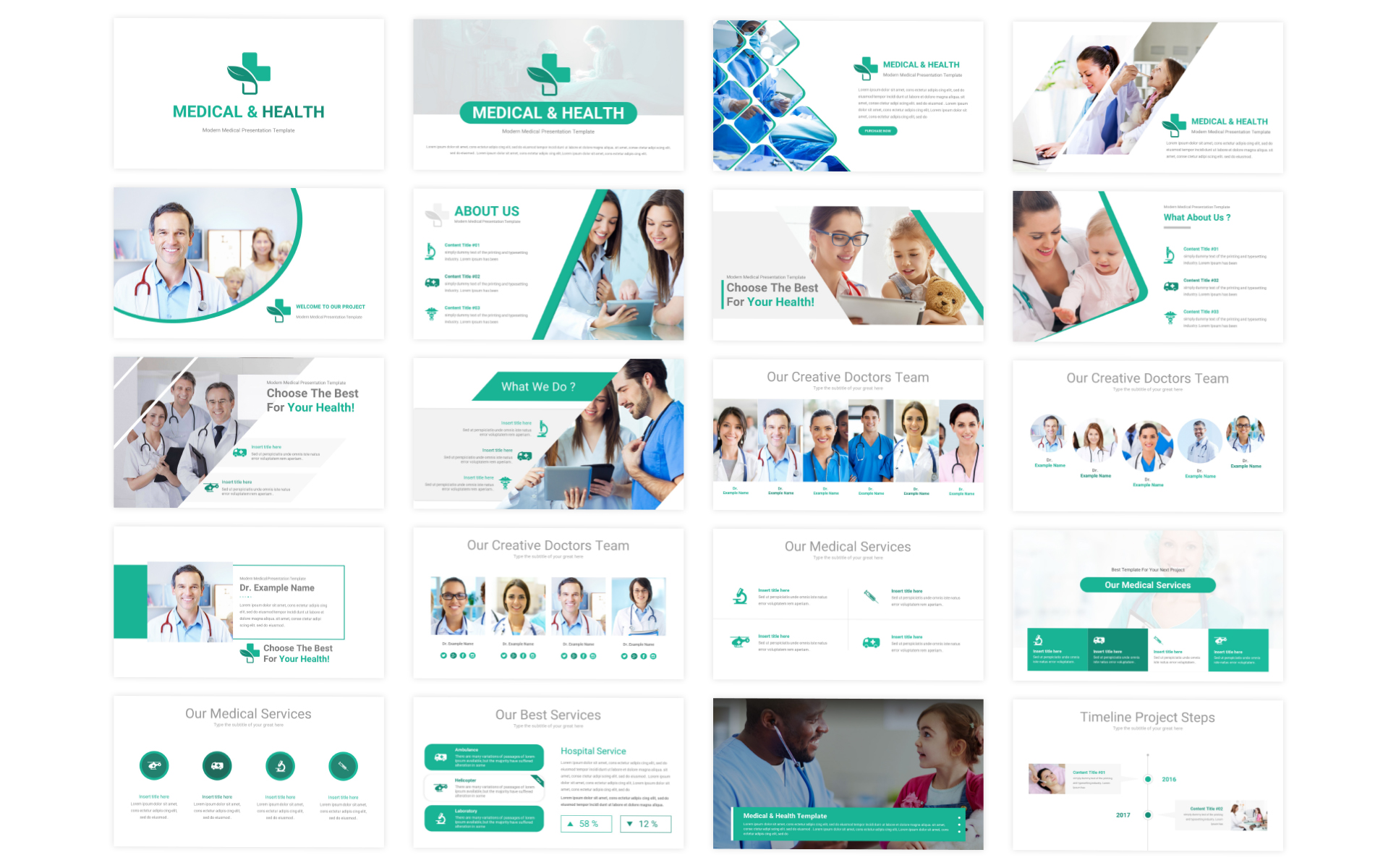 Medical & Health PowerPoint Presentation Template. template comes with 65 unique slides in HD resolution and features image placeholders, world maps, icons, and much more. Moreover, all the features are completely customizable so you can make your presentation fit your business or product. Whether you are a student or a business person you can get a great benefit from this template and ensure your presentation’ success.