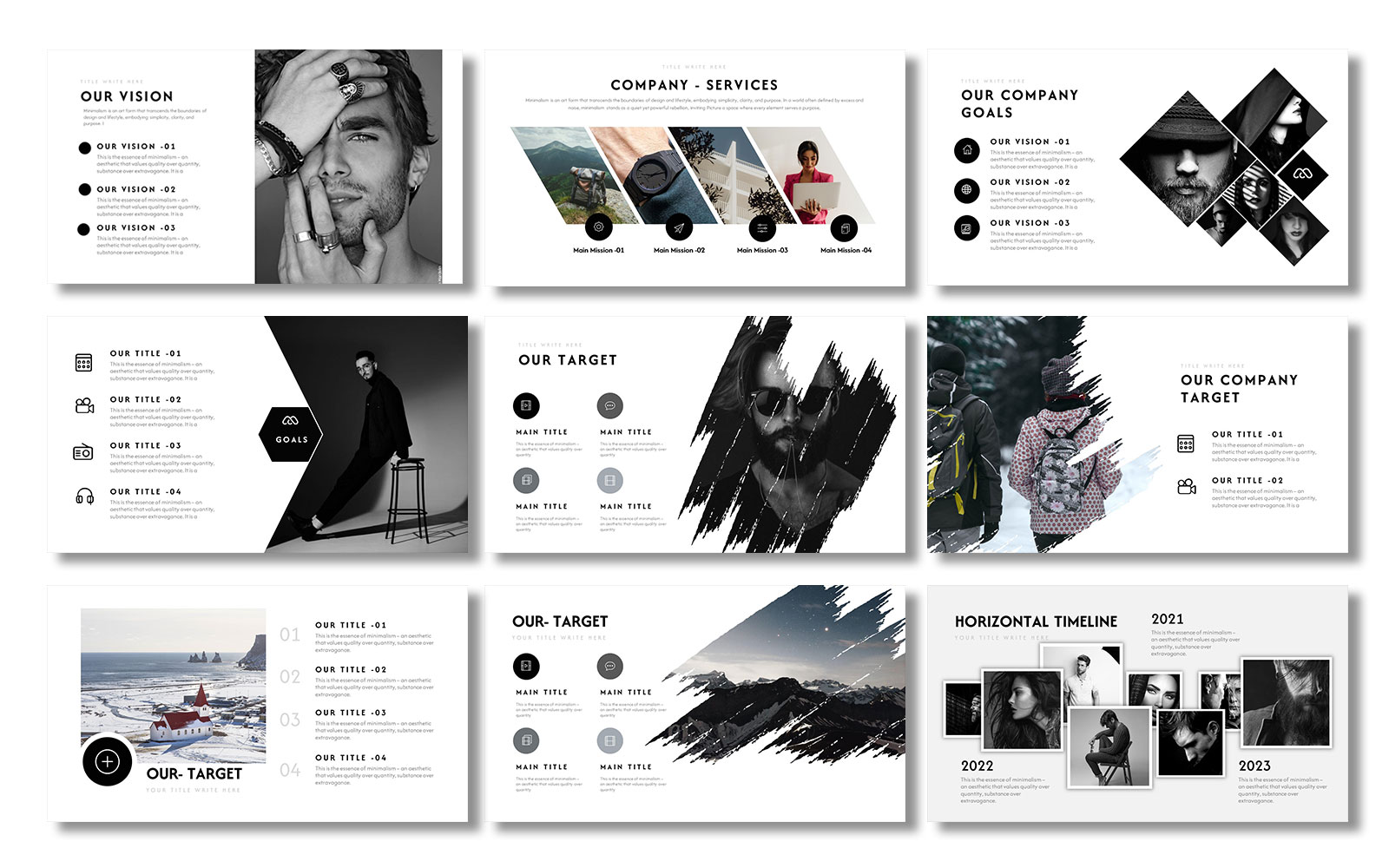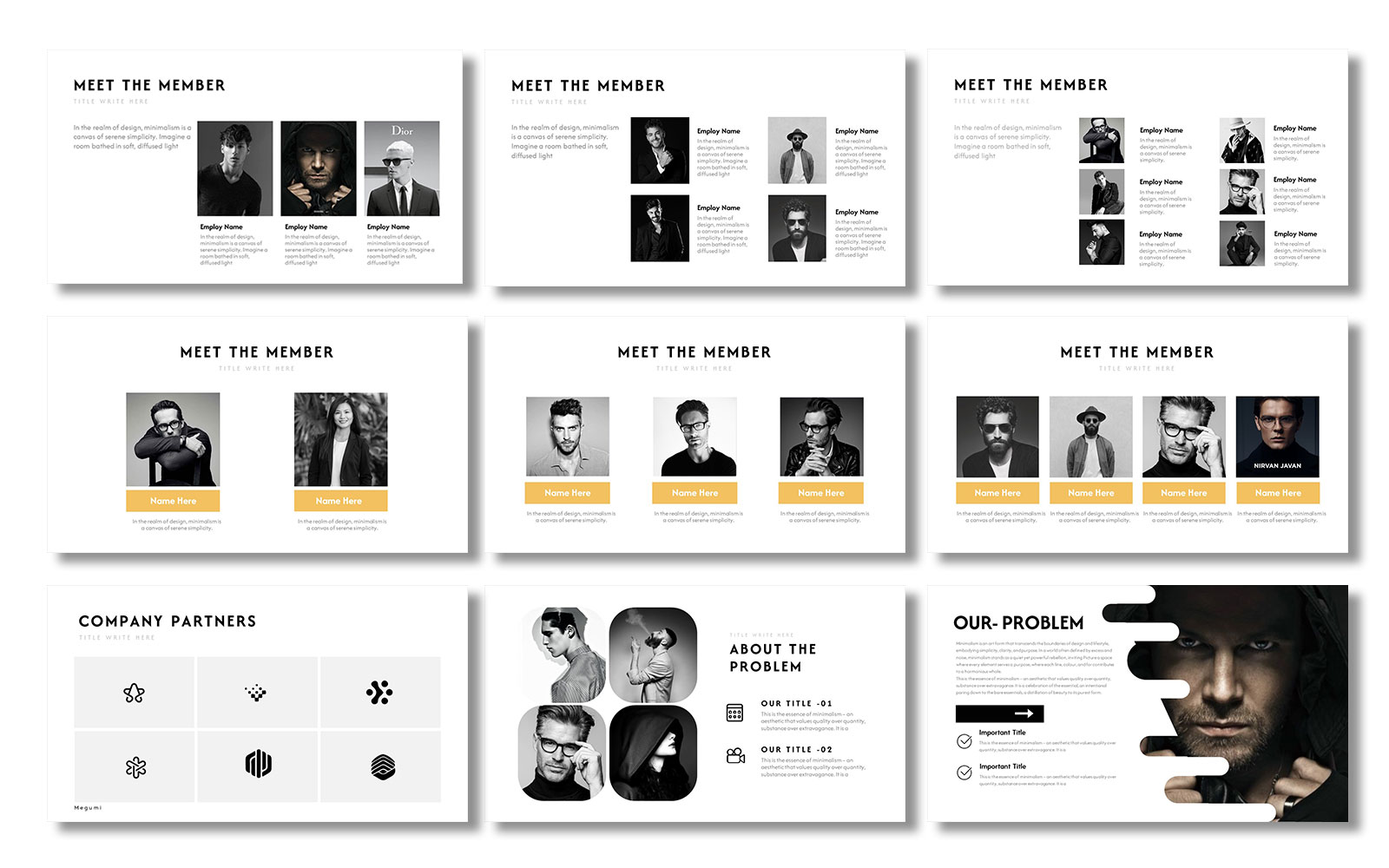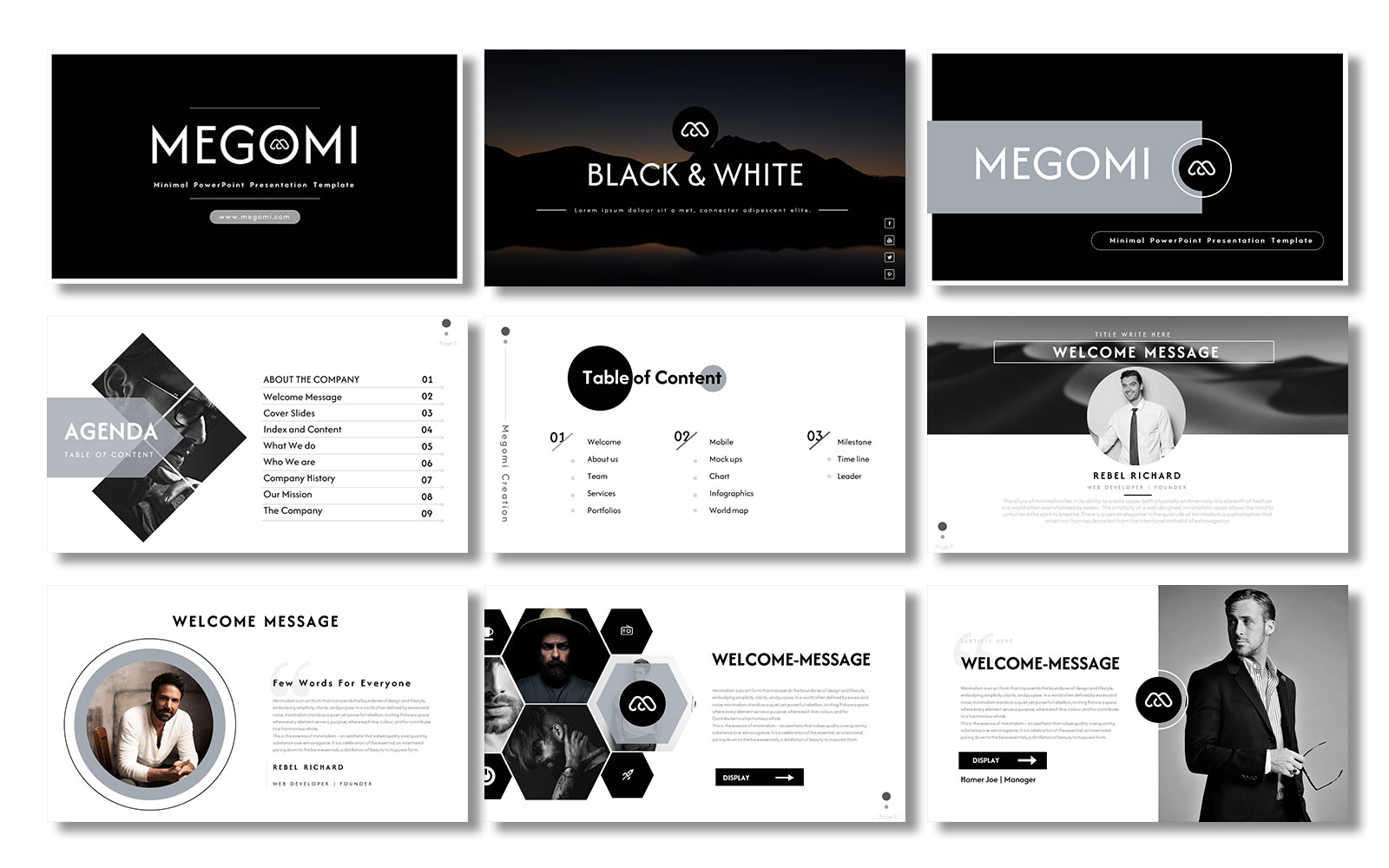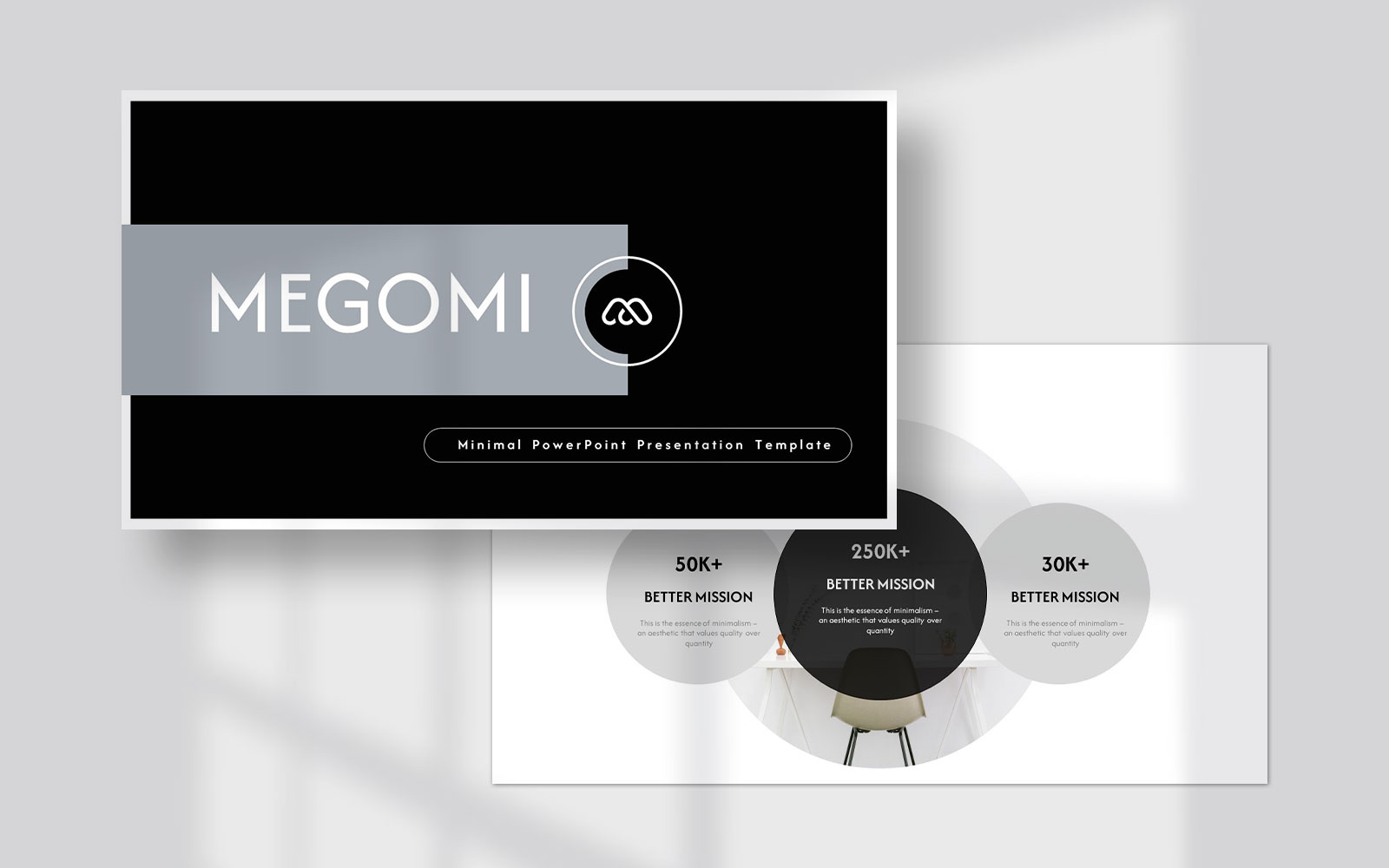 Megomi Minimal Powerpoint Presentation Template Get a modern PowerPoint presentation that is beautifully designed and functional. This slides comes with infographic elements, charts graphs and icons. This presentation template is so versatile that it can be used in many different businesses. This PowerPoint can be used for real estate market review, new business funding request, product reviews, marketing and promotions post launch review, market research, social media impact studies, education and training. With this many slides you are able to make a complete PowerPoint presentation (deck) that best suit your needs.