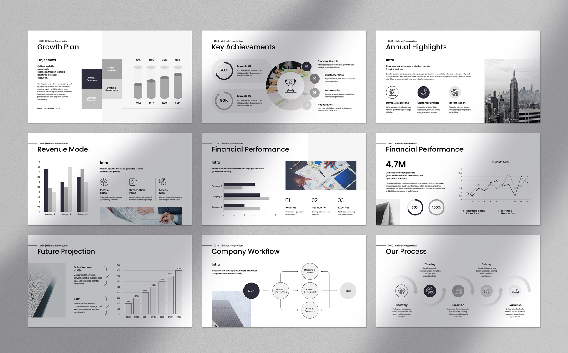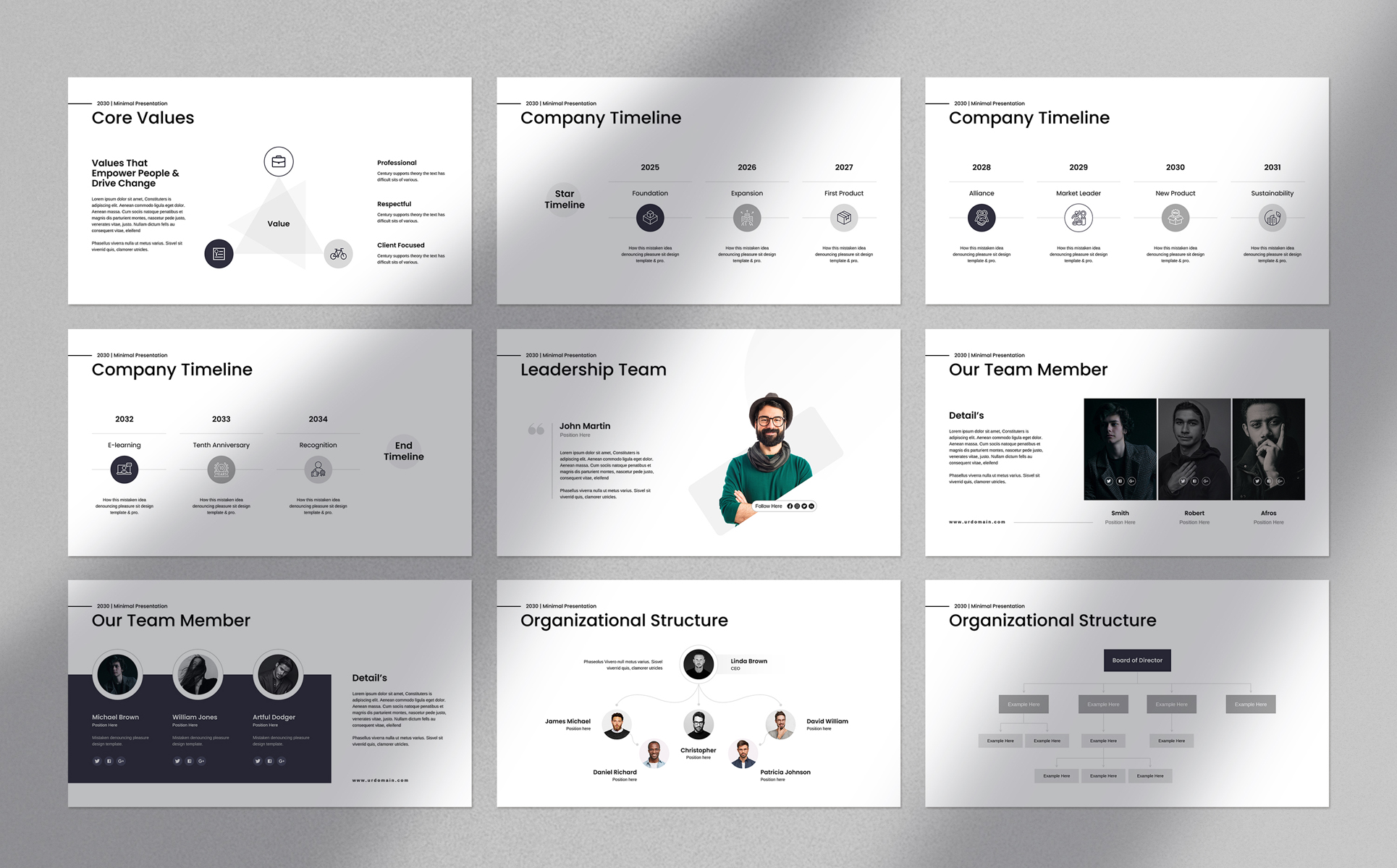 The layout includes essential slide types such as title pages, executive summaries, timelines, team profiles, data charts, infographics, and contact information. Visuals are purposefully minimal, ensuring smooth readability whether you're presenting in person or virtually. The typography is modern and professional, with consistent formatting across headings, subheadings, and body text.