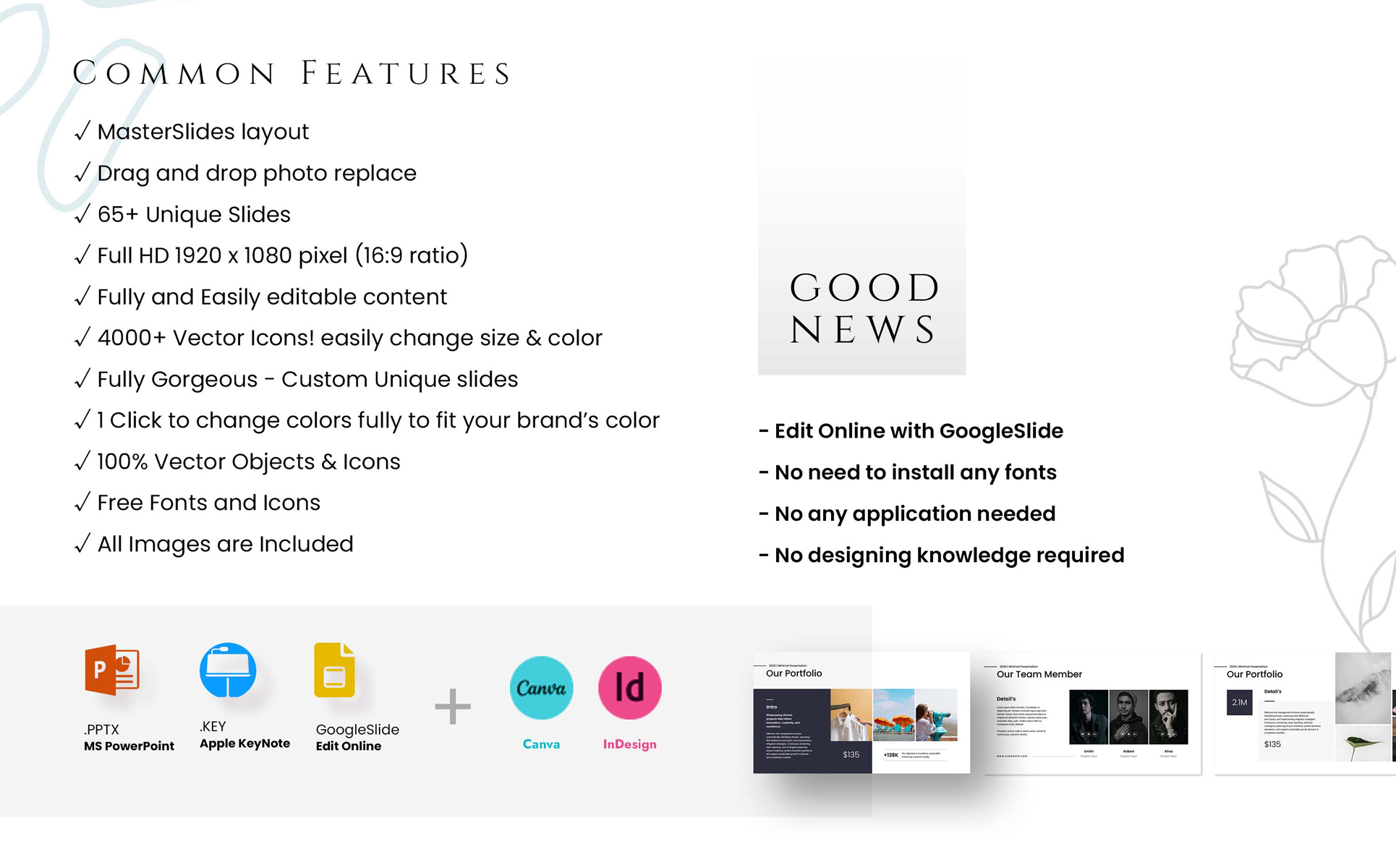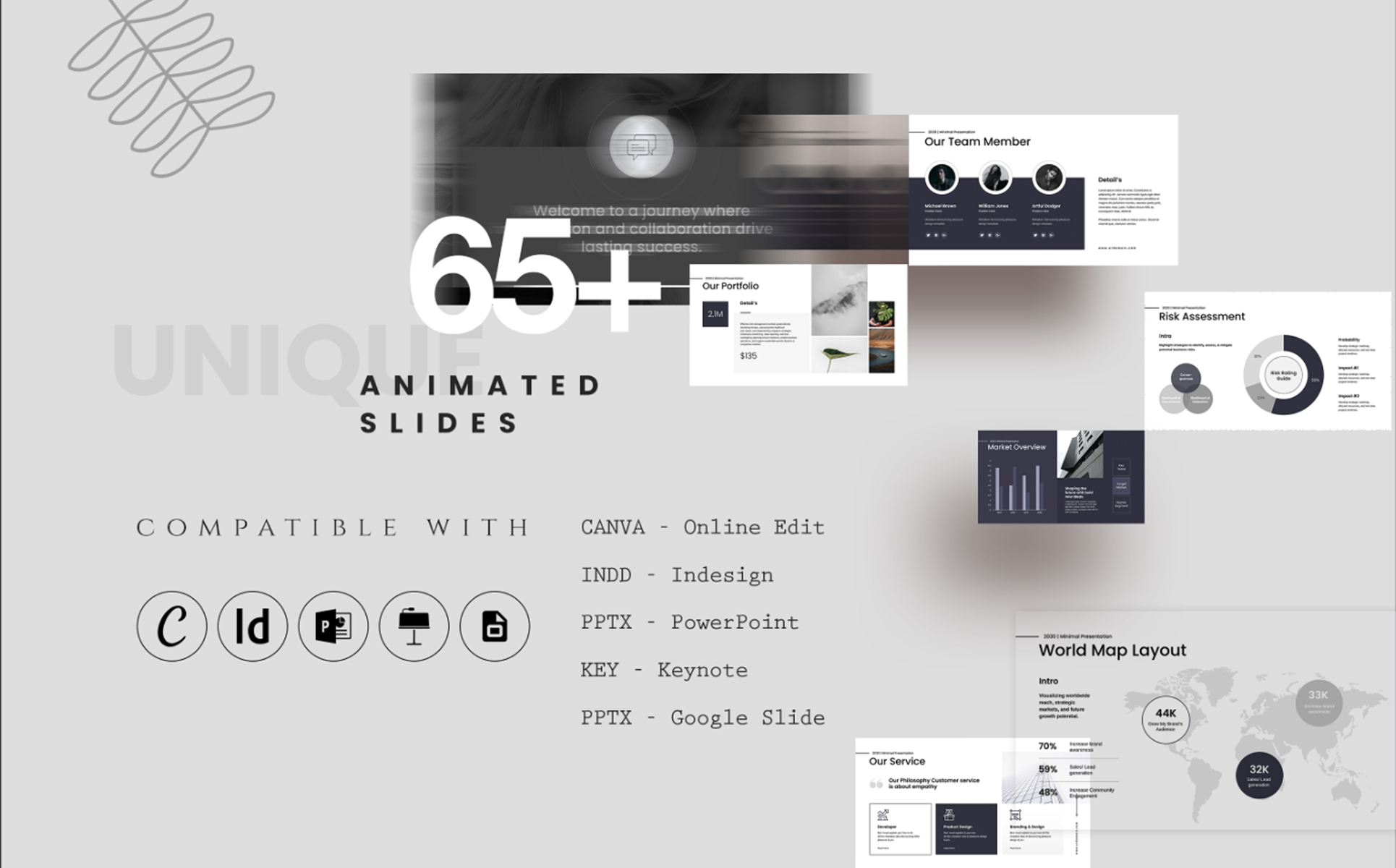 - **PPTX, KEYNOTE, GoogleSlide, Canva and InDesign** formats