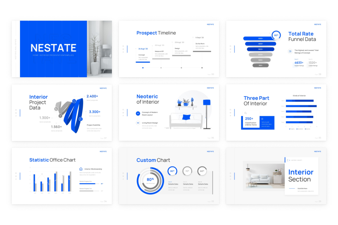 Do you want to impress audiences with your presentations, but you think that you’re always picking the wrong design? Don’t worry, Nestate Home Interior Clean PowerPoint Template is your solution. When you don’t want to start from scratch, but need a lot of creative freedom, here you'll find an overview of the latest features like well-structured slides, battle-tested fonts, and image placeholders yet fully editable visual elements. This presentation template is very suitable for any construction project ideas. Best thing of all? This Nestate Home Interior Clean PowerPoint Template also provides data visualization like charts, diagrams, and infographics for data interpretation. Deliver your next deck faster from our PowerPoint experts on our marketplace right away.