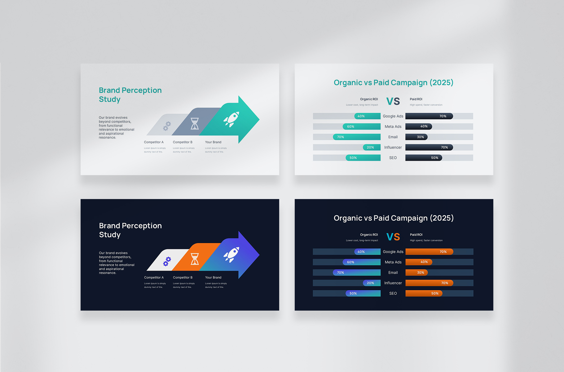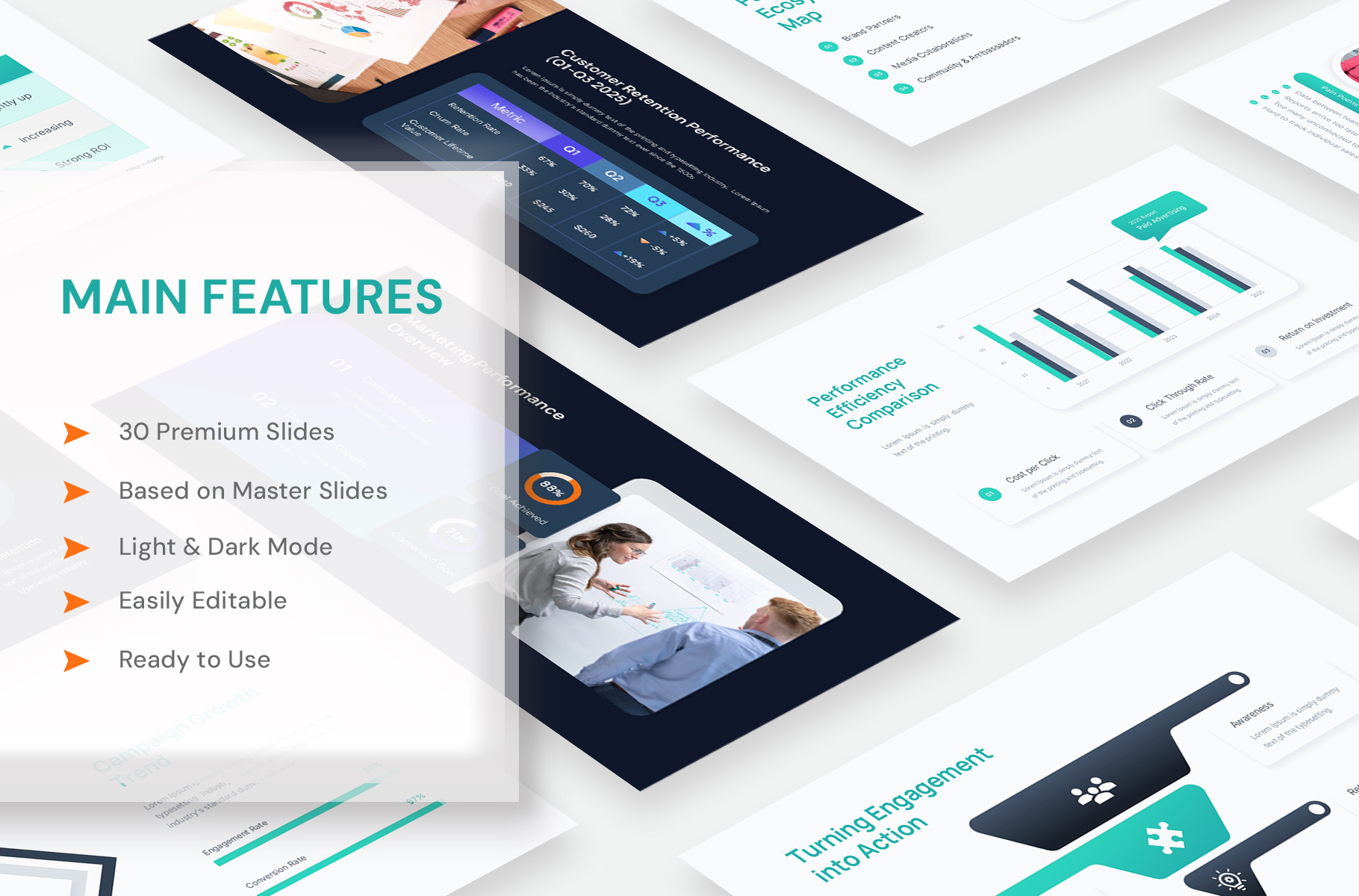 With 30 clean and organized slides, this template helps you showcase performance data, ROI insights, and strategic results with impact. Comes in light and dark mode versions, fully editable, and built for PowerPoint — making it perfect for marketing teams, agencies, and business reports. Highlight your story with elegant charts, minimal design, and data-driven visuals that keep your audience focused and engaged.