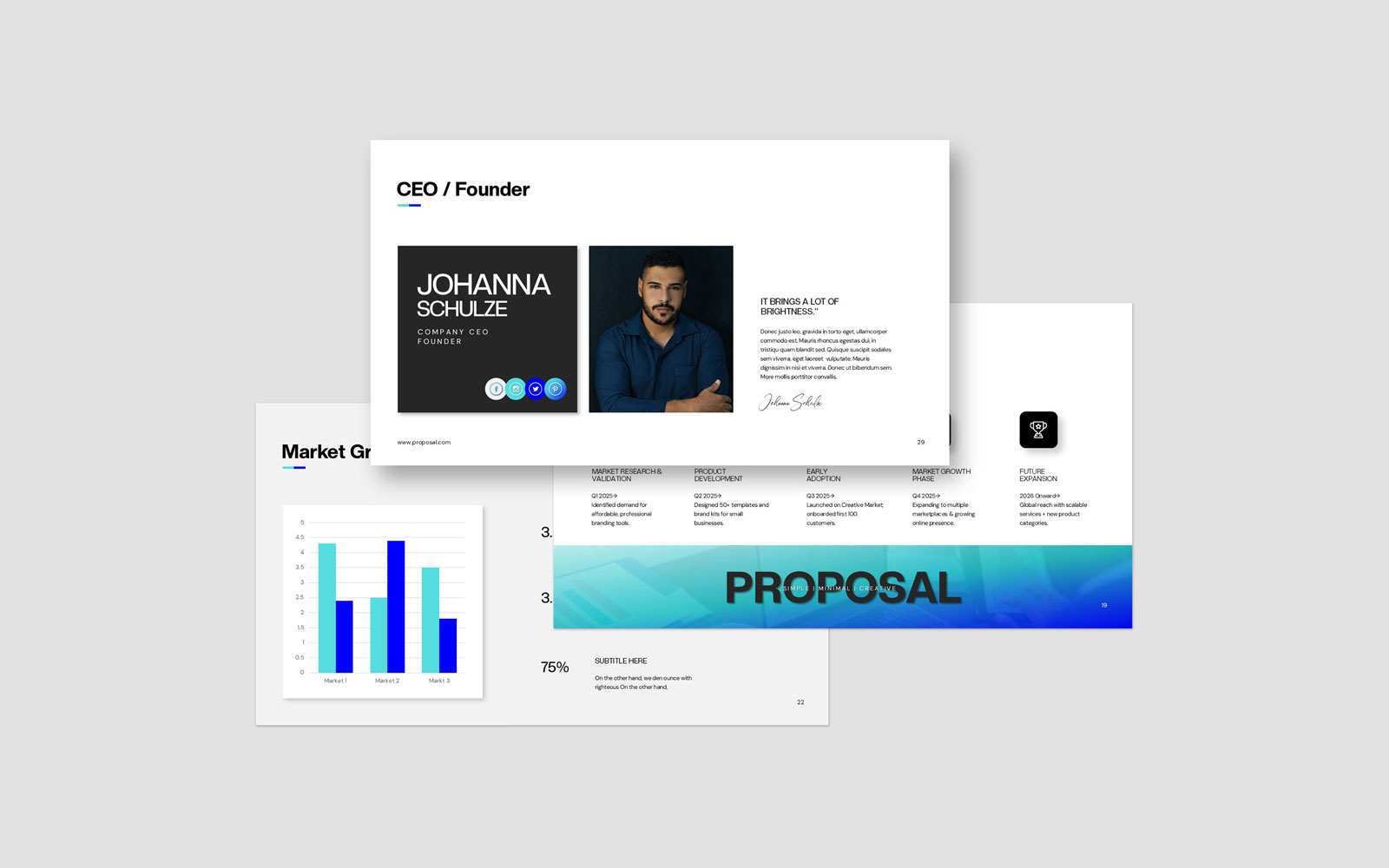 This presentation template is so versatile that it can be used in many different businesses, with this many slides you are able to make a complete presentation (proposal) that best suits your needs.